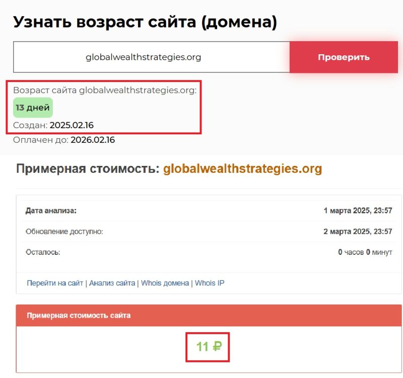 Все, «инвестиционная компания» готова. Но если посмотреть на возраст проекта, то становится понятно, что вся их легенда — полный бред. Согласно сервису Whois, сайт существует всего несколько дней — с 16 февраля 2025 года, а аферисты уже вовсю вещают о «многолетнем опыте». Очень удобная схема — написать, что компания якобы работает с 2015 года, и надеяться, что никто не станет проверять.
