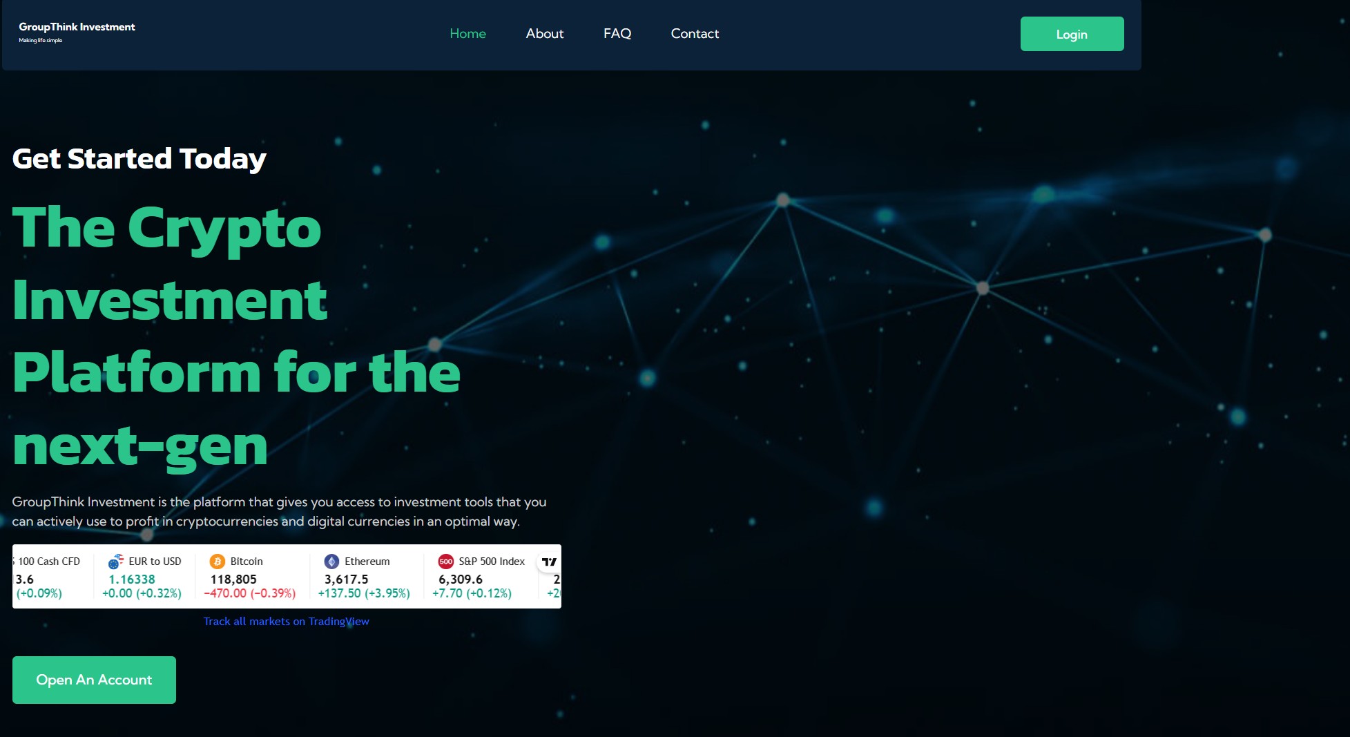 Очередной подозрительный «инвестпроект» под названием GroupThink Investment (groupthinkinvestment.com). Сайт встречает броским слоганом “Криптоинвестиционная платформа для следующего поколения”, сверкающим фоном и обещаниями легкого старта. Все сделано, чтобы вы поверили в солидность проекта. Но за красивой упаковкой скрывается очередной псевдоброкер с типичной схемой развода на деньги.