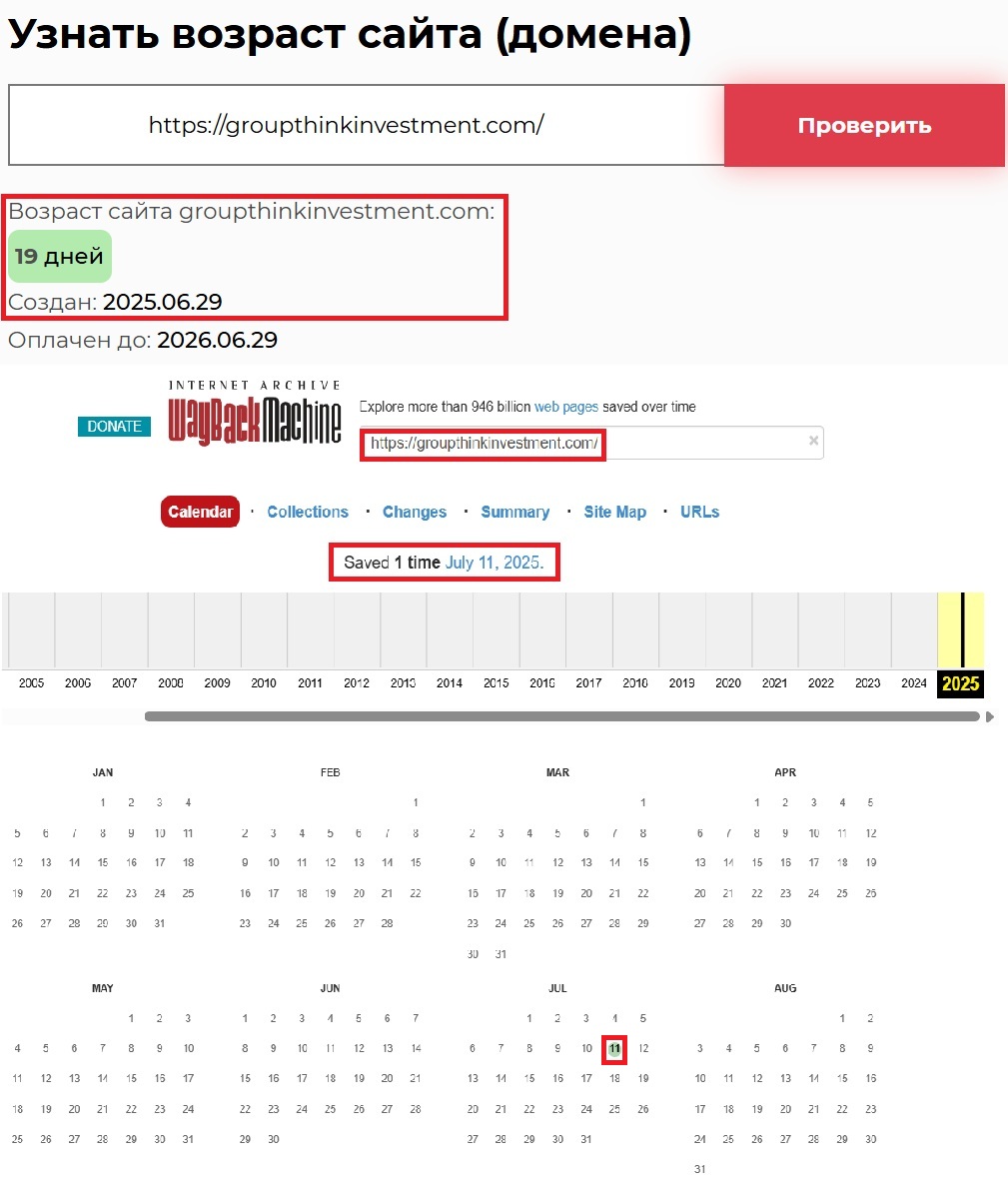 Чтобы не быть голословными, обратились к Веб-Архиву (https://web.archive.org/web/20250000000000*/groupthinkinvestment.com) — международной системе, сохраняющей копии сайтов за разные годы. Первая фиксация GroupThink Investment датируется 11 июля 2025 года. То есть весь проект появился менее месяца назад, несмотря на заявления о “годах работы”.