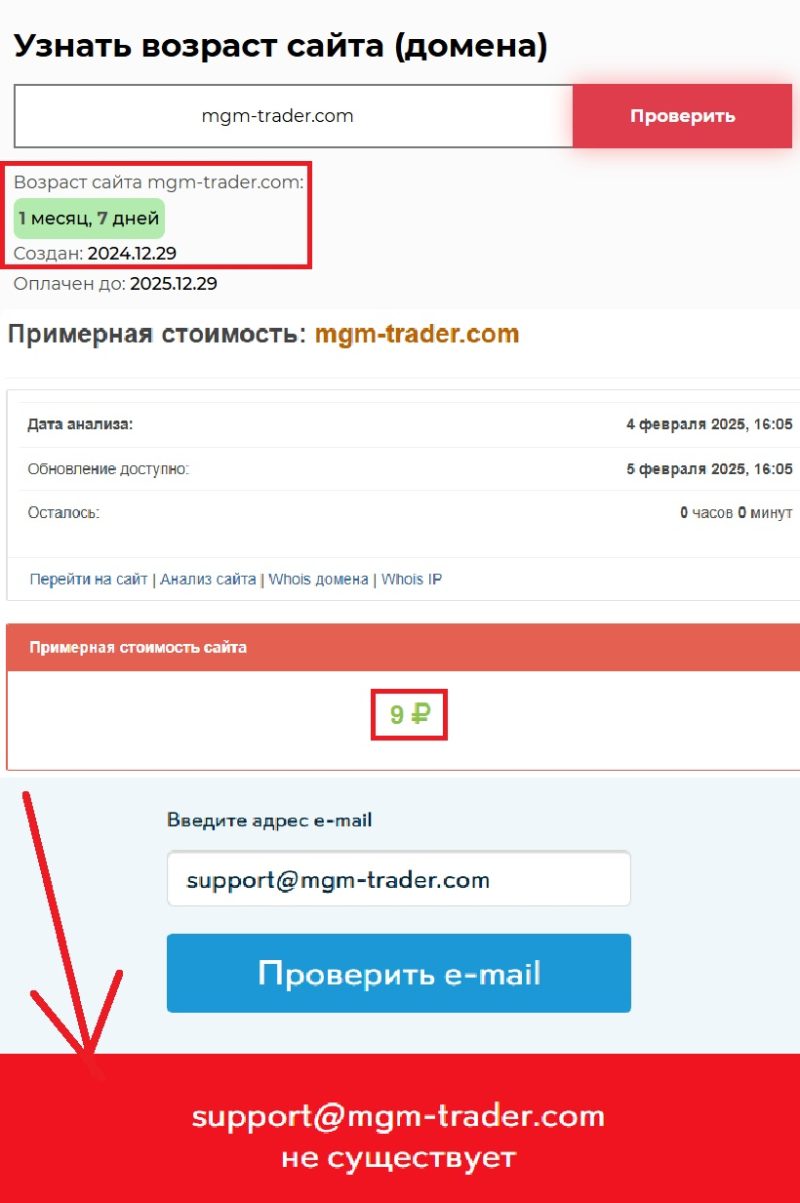 Сервис Whois наглядно показывает нам, что возраст проекта — всего 1 месяц и 7 дней, он начал свою деятельность 29 декабря 2024 года. Настоящий брокер не может работать столь короткий срок и при этом заявлять о многолетнем опыте. Более того, стоимость сайта — сущие копейки, а если быть точнее то ровно девять рублей. Это лишний раз подтверждает его фиктивность. Аферисты просто зарегистрировали дешевый домен и создали шаблонную контору, выдавая себя за серьезного финансового посредника.