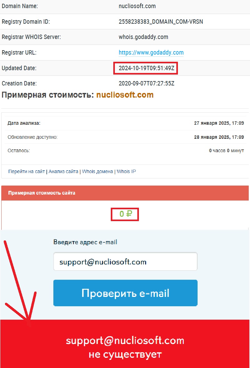 Проверка специальными сервисами показала, что Nucliosoft зарегистрирован совсем недавно, несмотря на заявления о многолетнем опыте. Домен был создан в сентябре 2020 года. Проблема только в том, что мошенники просто купили старый сайт и поменяли его под себя 19 октября 2024, что ничтожно мало для легальной компании. Более того, стоимость сайта ничтожно мала — ровно ноль рублей, что подтверждает низкий уровень вложений в его разработку.