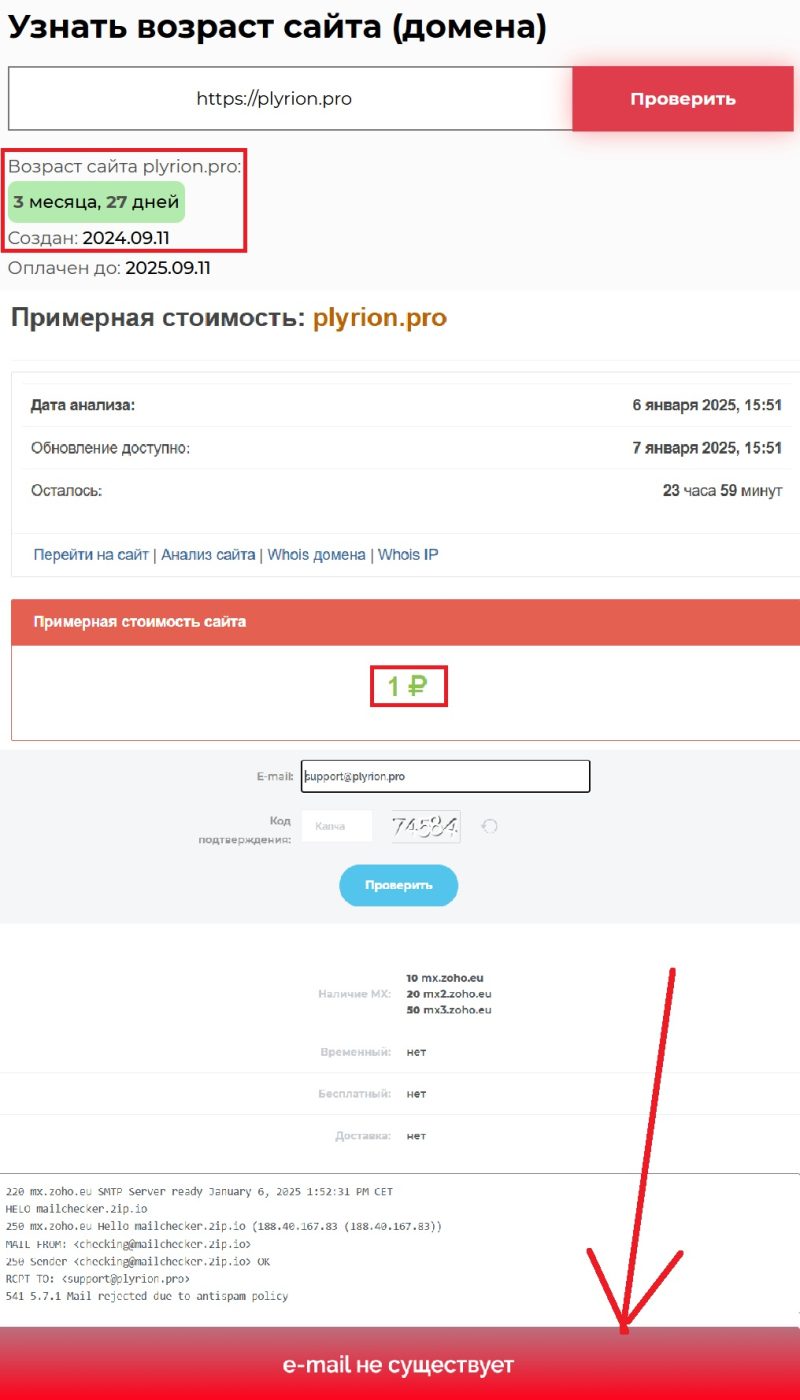 Проверка сторонними сервисами показала несколько интересных фактов. Как оказалось, сам сайт был зарегистрирован 3 месяца и 27 дней назад, то есть 11 сентября 2024 года. Это слишком маленький срок для легальной компании.
