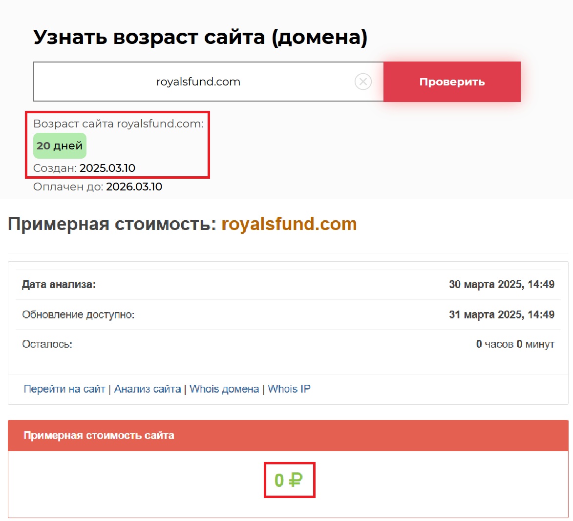 Если этого недостаточно, давайте обратимся к фактам. Royals Fund — это контора, появившаяся 20 марта 2025 года, то есть ей всего лишь 20 дней. Для серьезной компании это смехотворный срок. Но самое интересное — стоимость домена. Ноль рублей. Вы серьезно думаете, что компания, которая якобы оперирует на международных рынках и управляет миллионами долларов, экономит даже на собственном сайте? Смех, да и только.