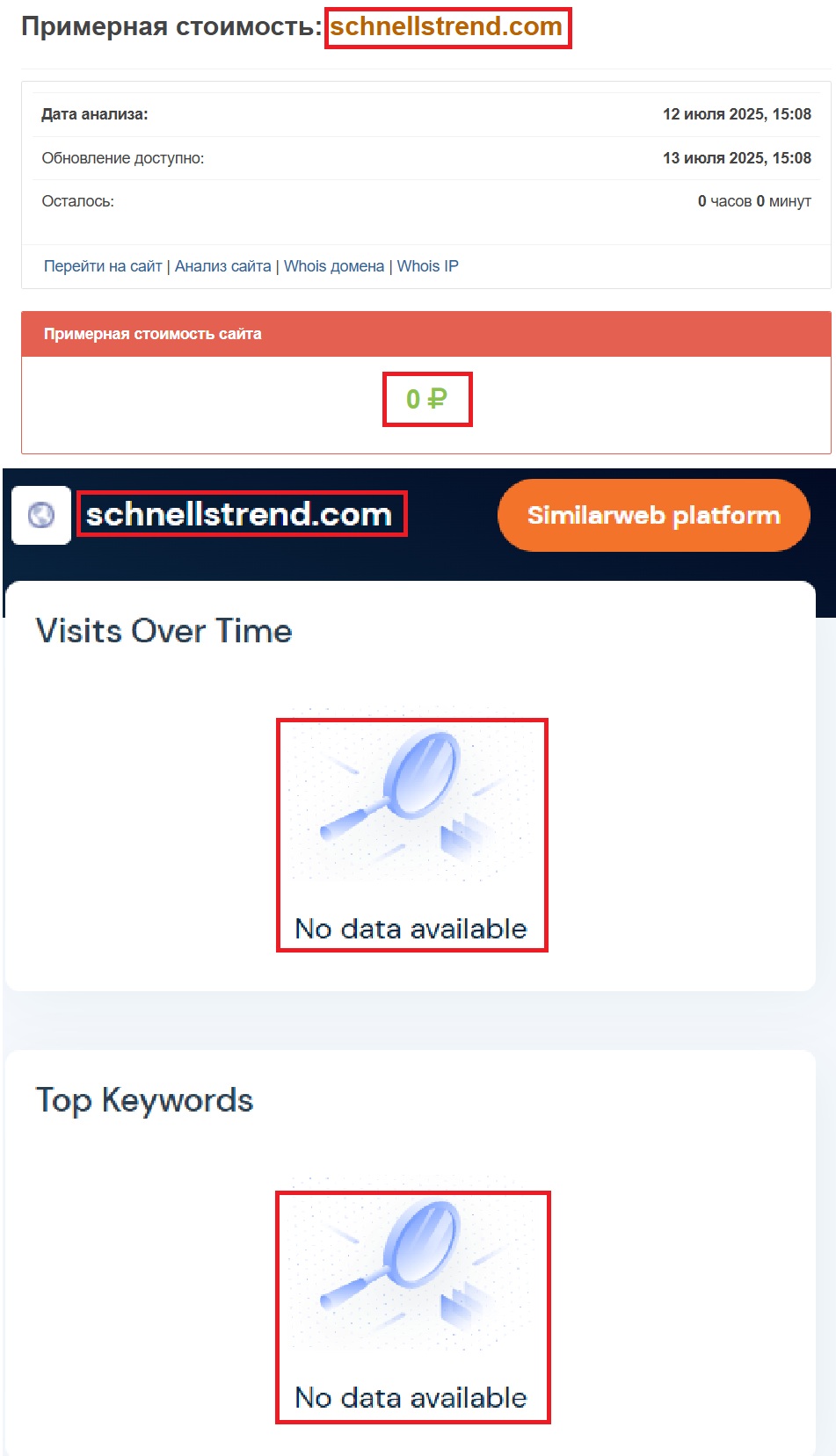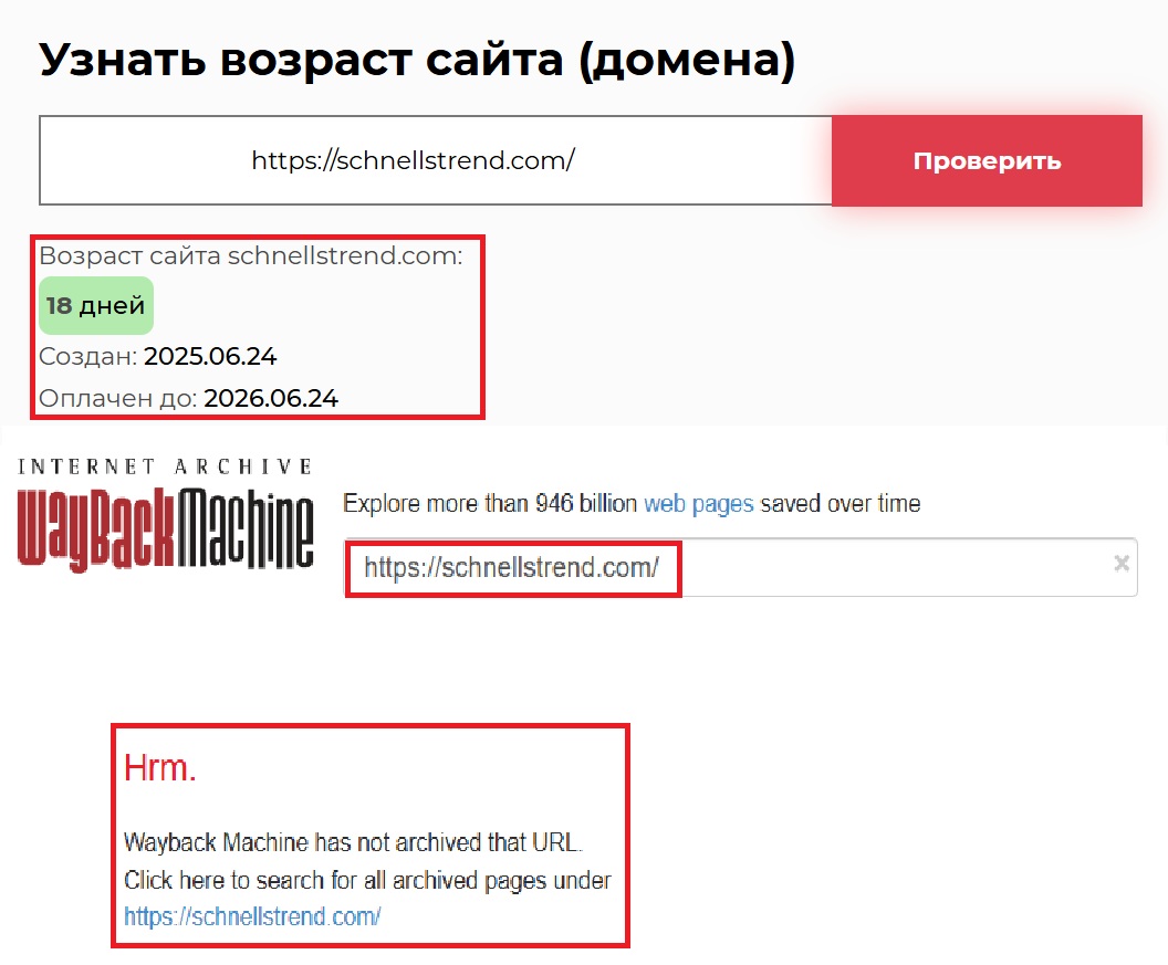 Чтобы понять, насколько правдива история проекта, обратились к Веб-Архиву (https://web.archive.org/web/2/https://schnellstrend.com/), где хранятся копии популярных сайтов за все время их существования. И снова мимо — упоминаний этого домена не фиксируется. Получается, никакой истории “с 2014 года” у них попросту не было.