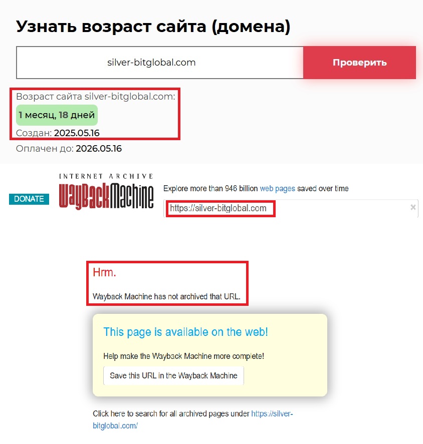 К тому же, если проверить историю домена и его изменений через Веб-Архив (https://web.archive.org/web/2/silver-bitglobal.com), то обнаружится, что этот сервис не архивировал silver-bitglobal.com. Это прямо говорит о том, что контора появилась недавно и не имеет достаточно опыта для работы с вашими инвестициями.