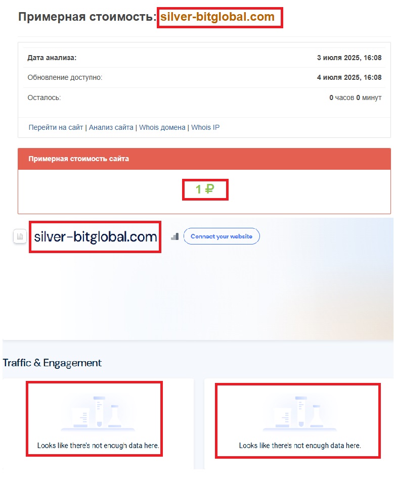 Как думаете, сколько стоит сайт реального брокера? Десятки тысяч рублей, сотни тысяч? Ну, тогда это не про Silver Bit Global (silver-bitglobal.com). Проверка специальным сервисом Seolik, который показывает стоимость сайта, показывает, что герой данного обзора использует домен стоимостью в один рубль. Кстати, посещаемость, которую легко проверить через SimilarWeb, демонстрирует нам низкую популярность выбранного лжеброкера.