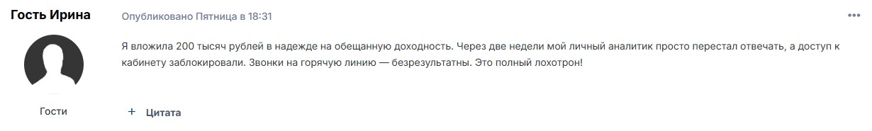 “Я потерял свои накопления и по итогу получил игнор и кучу долгов. Silver Bit Global это мошенники, они не помогают заработать, они сами на вас зарабатывают. И пусть сначала все хорошо, под конец они откровенно хамят и угрожают блокировкой если вы не пополните счет. Не ведитесь!”