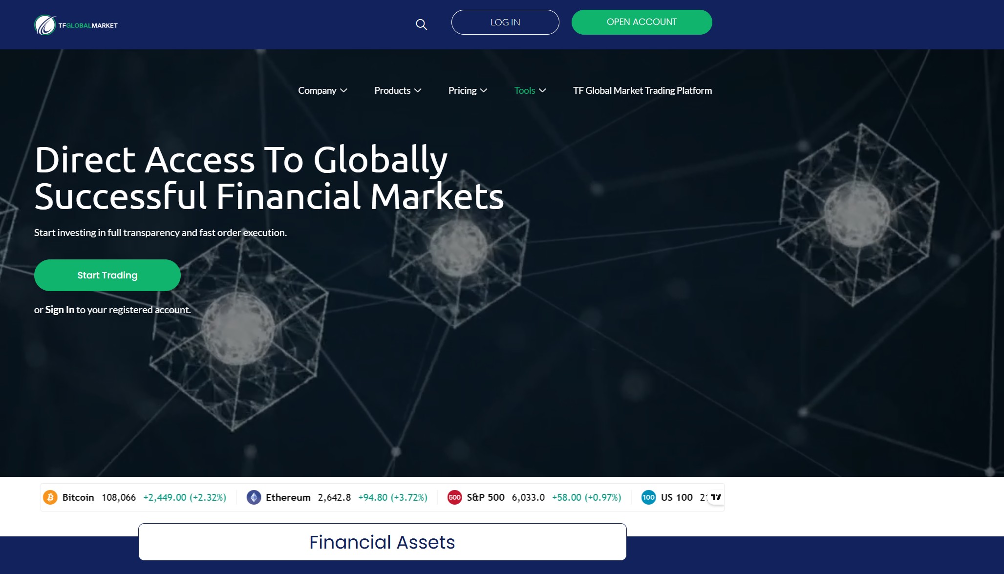 Мы начали с главного — с сайта, поскольку именно он часто становится первым касанием потенциального клиента с платформой. Адрес — tfglobalmarket.com. Открыв его, сразу ощущаешь дежавю: интерфейс — как под копирку. Такой шаблон уже не раз встречался в других мошеннических схемах. Меняются только цвета, логотипы и тексты, а суть остается прежней — заманить пользователя в ловушку, накидав фальшивых обещаний.