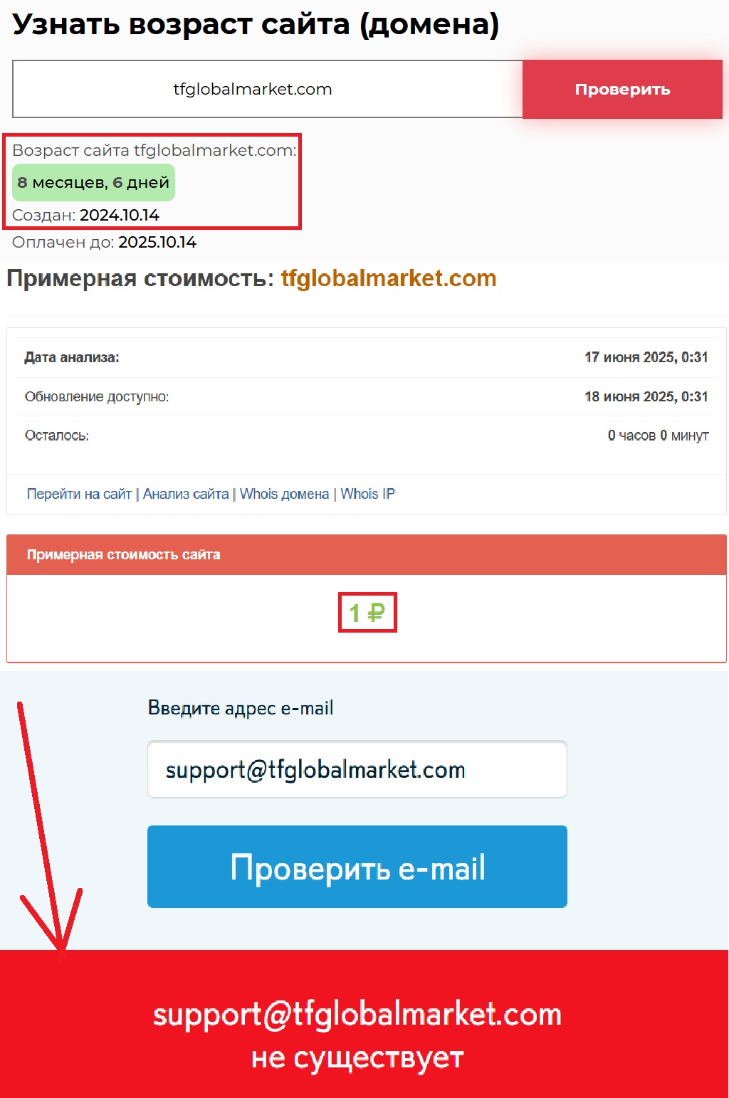 Мы также обратили внимание на контактную информацию. На сайте указан единственный адрес — support@tfglobalmarket.com. Попробуйте написать туда — в лучшем случае, получите шаблонный автоответ. А скорее всего, просто никакой реакции не будет. Это фейк. А теперь самое важное. Никакой лицензии. Ни упоминания о юрисдикции, ни данных о регистрации компании, ни доступа к каким-либо официальным документам. Это значит только одно: ваша защита как инвестора на этом сайте отсутствует полностью.