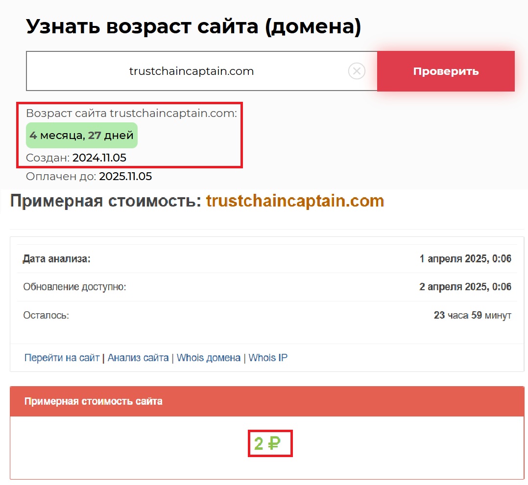 Однако на сайте Trustchaincaptain об этом ни слова. Проверка показала, что они заявляют о работе с 2010 года. Пятнадцать лет — внушительный срок, правда? Но стоит копнуть глубже — и правда раскрывается. Домен, на котором сейчас расположен их сайт, принадлежал совсем другой платформе. Лжеброкеры просто купили его 5 ноября 2024 года и начали свою аферу. И самое смешное — этот домен стоит два рубля. Вот и весь «опыт» компании, которой доверяют деньги наивные инвесторы. Вы бы рискнули?