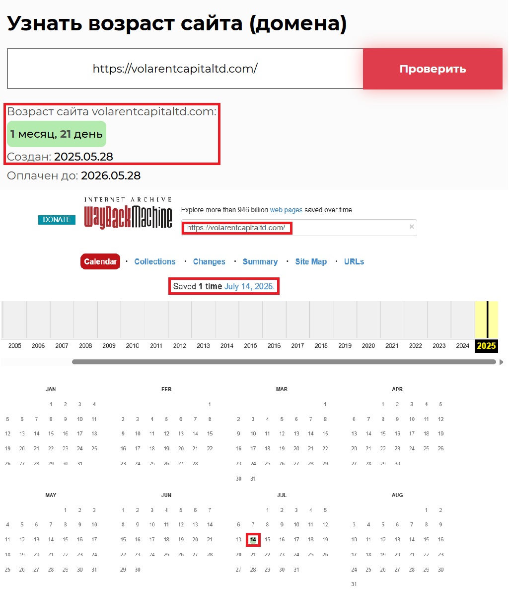 Заглянули мы также и в Веб-Архив (https://web.archive.org/web/20250000000000*/https://volarentcapitaltd.com/), сохраняющий архивную копию страниц и что вы думаете? Одно упоминание 14 июля 2025 года, это уж точно не срок для легального брокера. А также SimilarWeb показывает реальный трафик — нулевой.