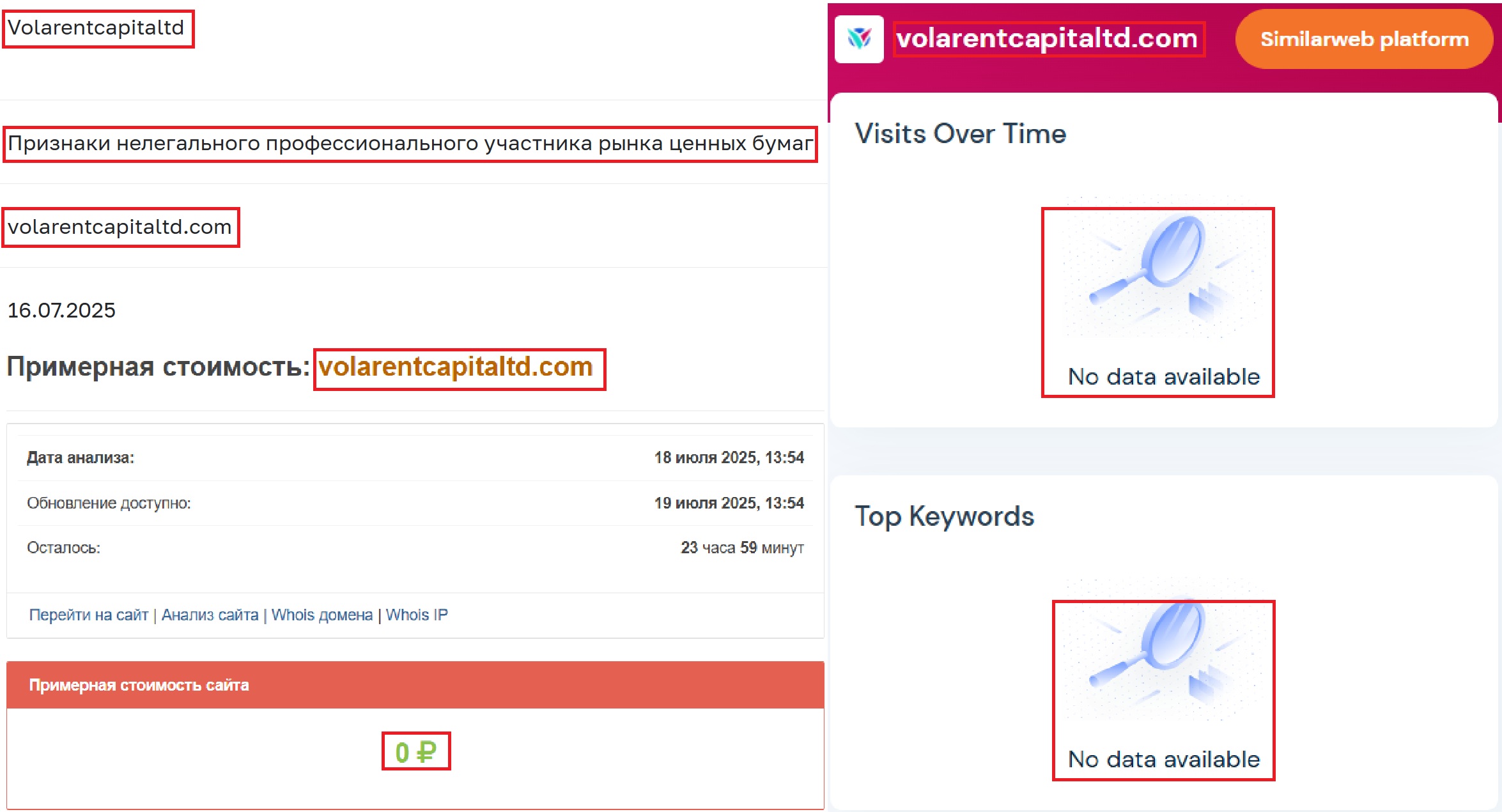 Официальный сайт внушает доверие: уверенные формулировки, «гарантированные» доходы, лицензии якобы от серьезных регуляторов. Однако стоит копнуть глубже, и вскрываются неприятные факты. При помощи инструментов анализа становится ясно: перед нами не брокер, а подставной ресурс. Seolik проверяет SEO-параметры сайта и демонстрирует нам, что стоимость лохотрона составляет ровно 0 рублей. О каких услугах тут вообще может идти речь? Whois (https://who.is/whois/volarentcapitaltd.com), выдающий данные о регистрации домена показывает нам настоящий возраст — 1 месяц и 21 день.