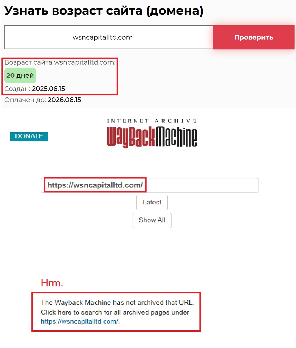 Первое, на что стоит обратить ваше внимание — это возраст сайта. Аферисты всеми силами стараются создать иллюзию многолетнего опыта и профессионализма, а на деле пятисекундная проверка через сервис Whois (https://who.is/whois/wsncapitalltd.com), анализирующий историю домена, показывает что он появился всего лишь 20 дней назад, то есть 15 июня 2025 года. Это ничтожно маленький срок для легальной компании.