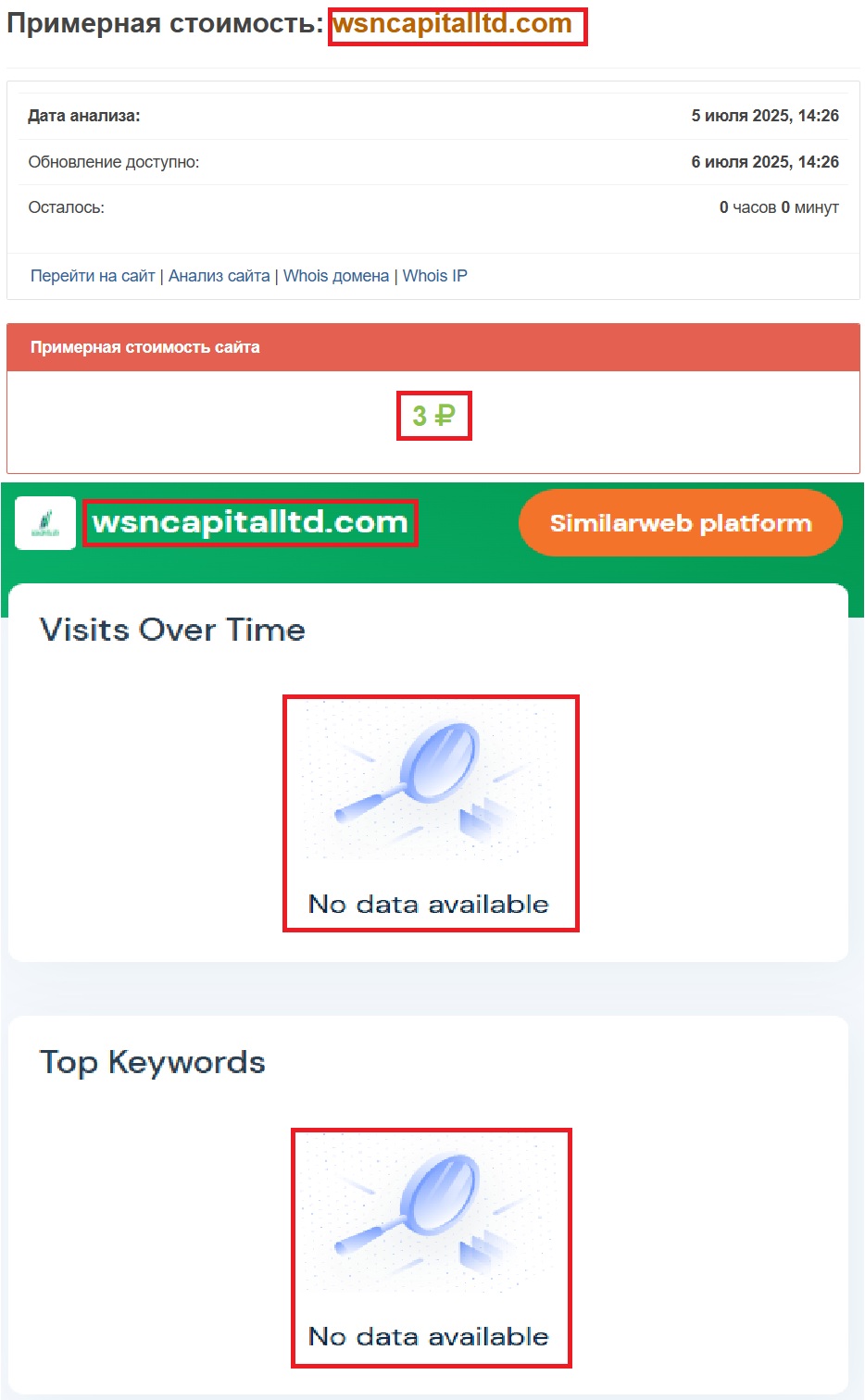 Герой данного обзора особо не стал стараться и создавать качественный сайт. С другой стороны — а зачем? Проект не будет работать долго, скорее всего закроется спустя пару месяцев, как только наберет негативные отзывы. Seolik — сервис показывающий стоимость сайта — подтверждает этот факт, ведь цена домена WSN Capital Finance Limited составляет ровно три рубля. И если вы думаете, что проект популярен, то ошибаетесь, у SimilarWeb нет данных о посещаемости конторы, а значит она крайне мала.