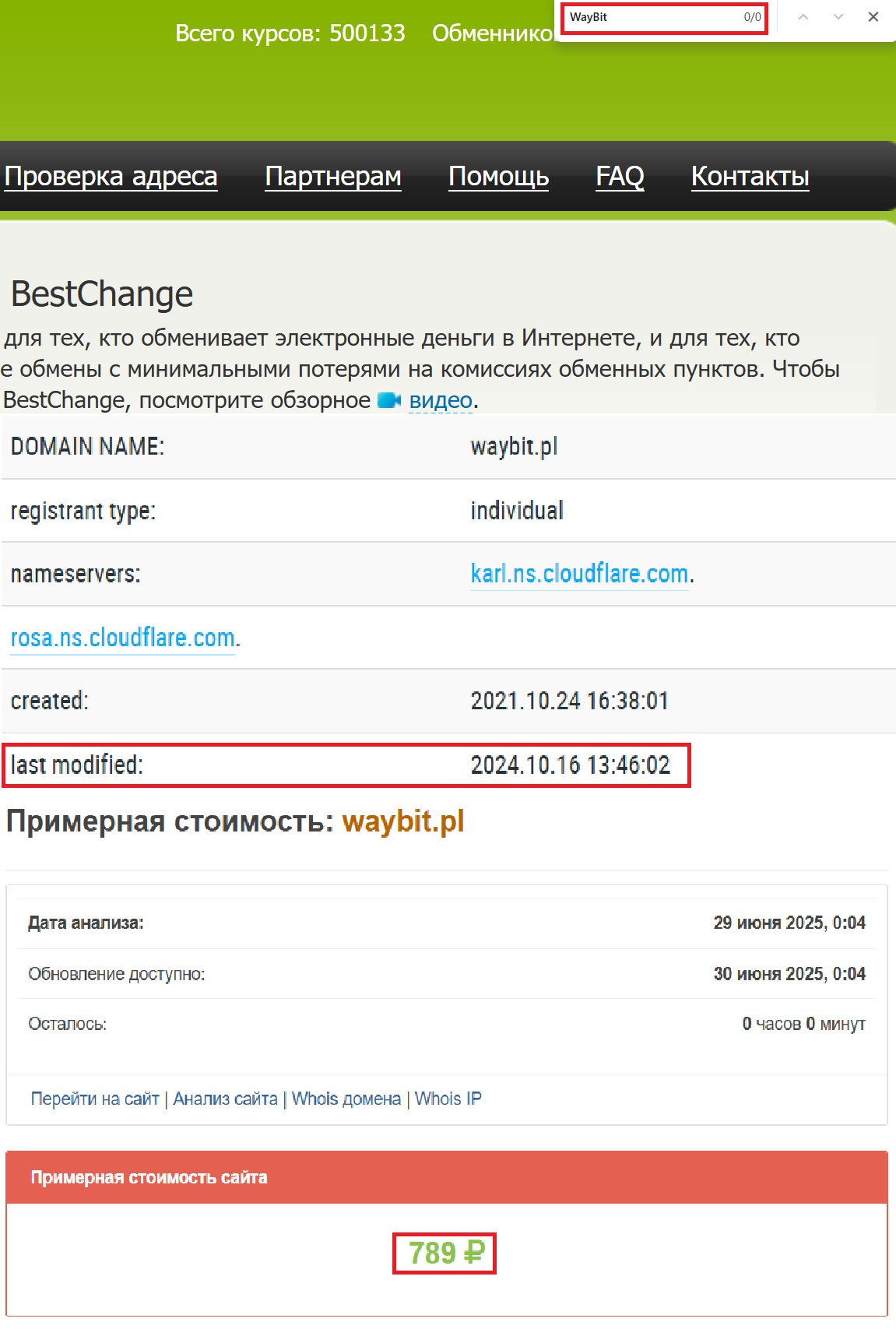И еще важный момент. Многие пользователи могли бы поверить в то, что WayBit — старожил рынка. Все же дата регистрации домена — октябрь 2021 года. Однако это — обманчивое впечатление. По факту активность на сайте началась только в октябре 2024-го. Просто кто-то приобрел старый домен, чтобы создать иллюзию надежности. Стандартный ход — ничего нового. И, что совсем неудивительно, площадка стоит ровно 789 рублей, что крайне мало для таких платформ.