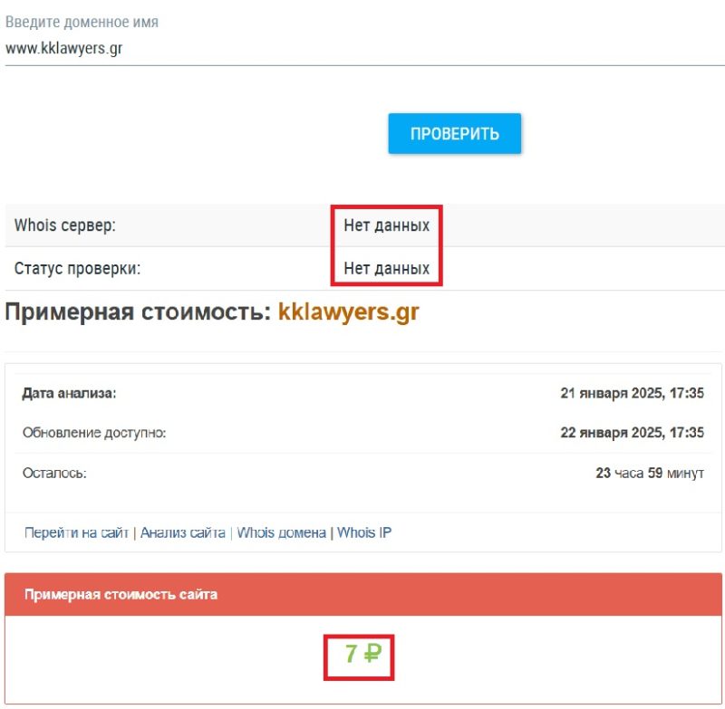 Проверка сторонними сервисами показала, что герой данного обзора яростно скрывает все данные о домене, который он использует. KANELLAKIS LEGAL SERVICES не указывает ни дату создания, ни дату обновления. Это все говорит о том, что мошенникам явно есть что скрывать.