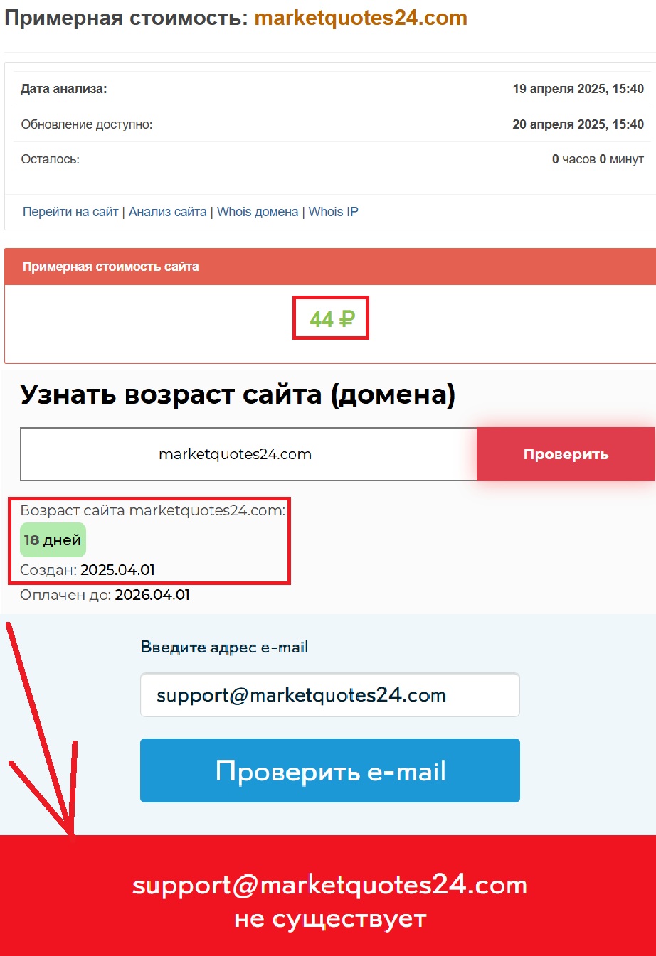 Если вам все еще интересно, что же там с датами и цифрами, то тут тоже все не очень радужно. На первый взгляд может показаться, что сайт живет уже приличное время — ведь аферисты рассказывают о работе с 2015 года. Но не спешите радоваться. Настоящая деятельность началась только с 1 апреля 2025 года. И вот еще момент, на который невозможно не обратить внимания. Текущая стоимость сайта — 44 рубля. И тут уже возникают вопросы. Что может стоить подобную сумму в наше время? Уж точно не платформа с реальными инвестиционными инструментами и поддержкой профессионалов.