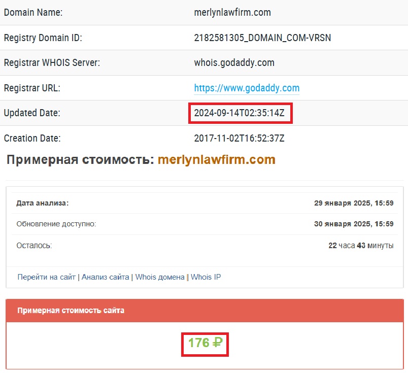 Самая большая проблема заключается в полном отсутствии прозрачности. Мошенники уверяют, что никакой предоплаты не требуется, и оплата их услуг произойдет лишь после успешного завершения дела. Но реальность совсем другая. Возраст проекта ничтожно мал, несмотря на то, что домен был зарегистрирован давно. История сайта показывает, что активную деятельность он начал лишь недавно — 14 сентября 2024 года, что характерно для мошеннических схем. Стоимость сайта также вызывает вопросы – всего 176 рублей, что совершенно не соответствует уровню серьезной юридической компании.