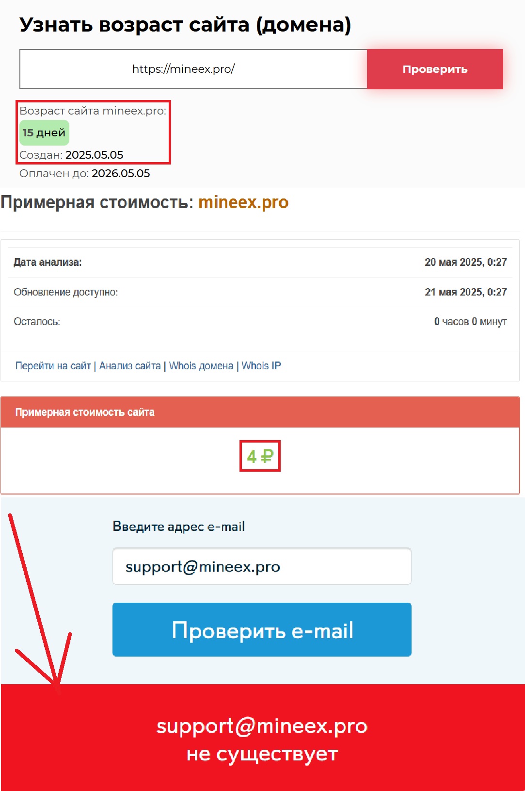 Мы проверили, есть ли у этой конторы вообще лицензия, регистрация, что-то, что указывало бы на законность их деятельности. Увы, ничего. Ни регистрационного номера, ни сведений о контролирующем органе, ни документов. Только пустые обещания и форма обратной связи. Ну и не стоит забывать о том, что мошенники указали фейковую почту support@mineex.pro.