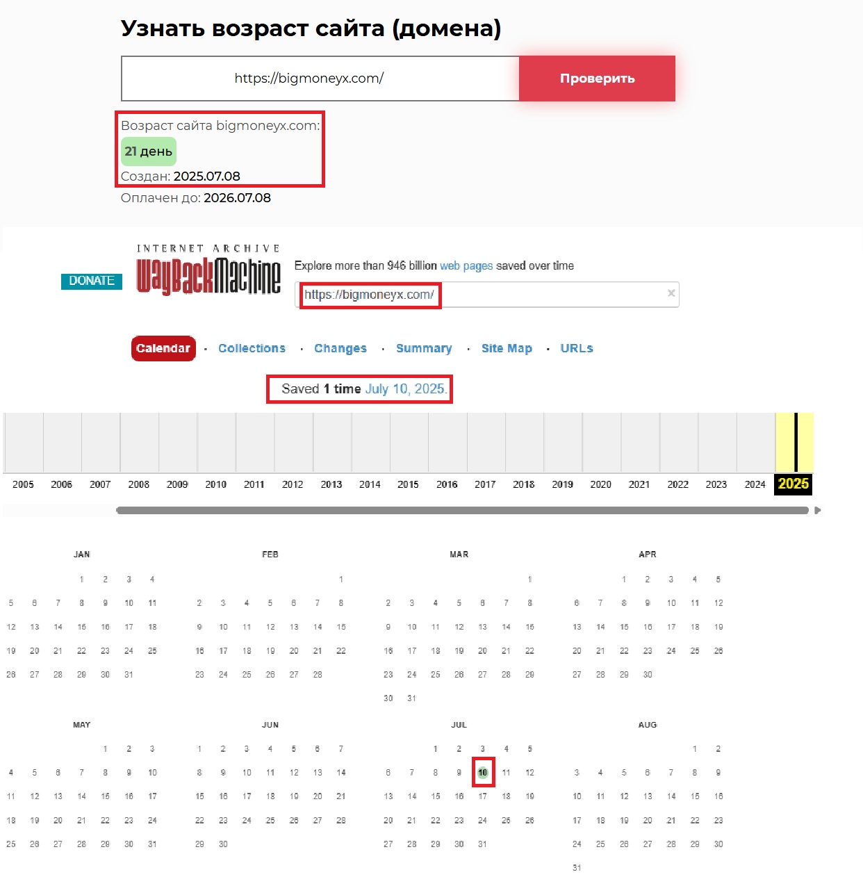 Следующий инструмент — Веб-Архив. Он позволяет заглянуть в прошлое сайта: снимки страниц, их история, частота обновлений. В случае с bigmoneyx.com — в архиве одно упоминание 10 июля 2025 года. Это подтверждает, что сайт появился совсем недавно и был создан исключительно для обмана.