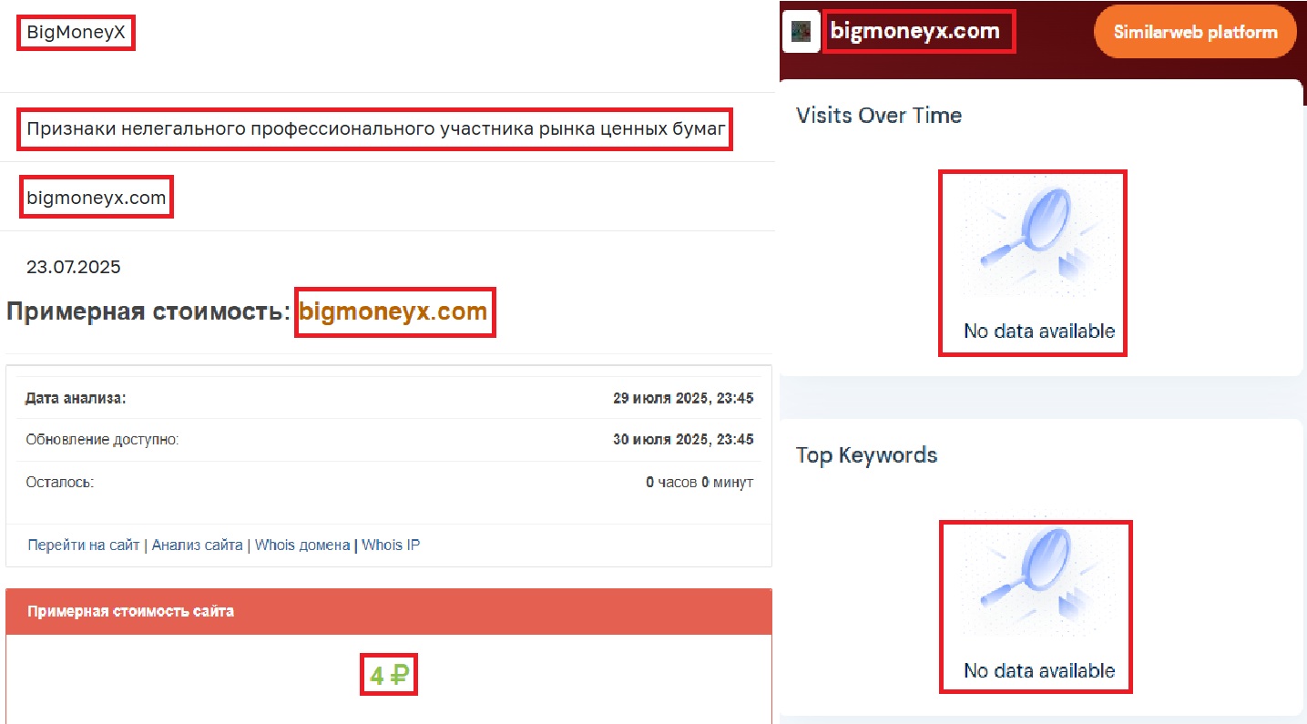 Идем дальше — проверка через Seolik. Этот сервис оценивает стоимость домена, исходя из его трафика, возраста, индексации в поисковиках. BigMoneyX стоит 4 рубля. Даже не доллар. Такой «бизнес» — с сайтом за четыре рубля — должен вызывать только недоверие. По данным SimilarWeb, трафик у ресурса фактически отсутствует. Люди туда не заходят, не торгуют, не интересуются — потому что это мертвая площадка.