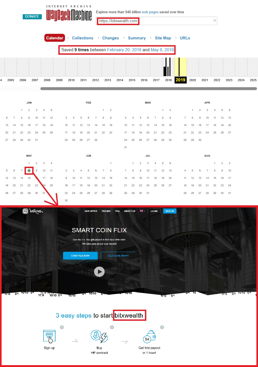 Одна из первых зацепок — дата регистрации домена. На Whois (https://who.is/whois/bitxwealth.com) видно: bitxwealth.com зарегистрирован 30 мая 2025 года, хотя нам врут о какой-то многолетней истории работы. Это распространенная уловка — убедить, будто перед вами надежная платформа. Проверить все можно через Веб-Архив (https://web.archive.org/web/20180817124526/https://bitxwealth.com/) — в архиве, где демонстрируется история того или иного домена, можно найти упоминания об этом проекте, которые датируются 20 февраля и 8 мая 2019 года, но тут этот проект связан больше с криптовалютой, а не с трейдингом и инвестированием. То есть, раньше сайт принадлежал другому проекту, что видно на скриншоте ниже.