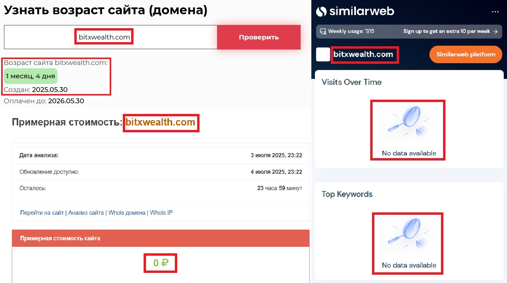 Цена сайта, кстати, тоже показательна — 0 рублей. Да-да, именно столько стоил домен, за которым якобы стоит «команда профессионалов». В то время как у легальных брокеров стоимость платформы — это десятки, а то и сотни тысяч рублей. Лицензии? Регистрация? На сайте лишь размытые слова про законность — даже кликая на номер регистрации в футере 72773278, мы попадаем на компанию с названием BTX Consult B.V., которая никак не связана с героем данного обзора. Анализ через SimilarWeb показывает, что посещаемость у сайта мизерная. Это значит одно: люди не доверяют, да и не знают о нем.