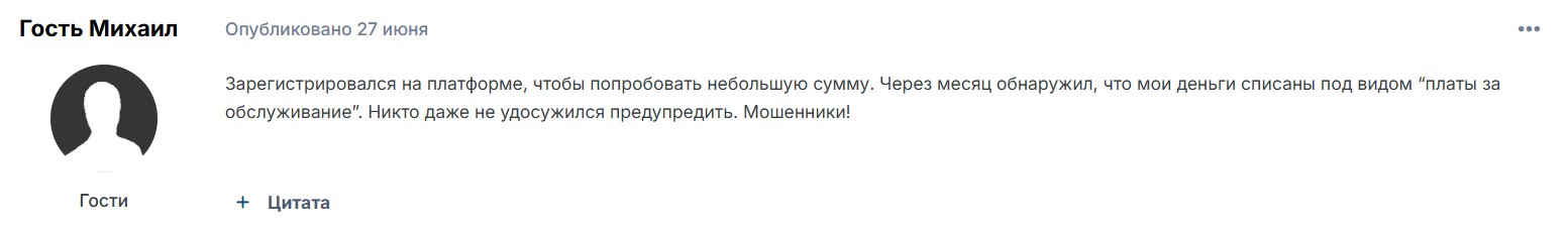 “BitexWealth — это самое большое разочарование в моей жизни. Я внес туда свою зарплату, свои сбережения, подговорил внести деньги мою жену и маму, даже кредитов набрал. А теперь остался у разбитого корыта, на связь аферисты не выходят, к аккаунту доступа нет. Не повторяйте моих ошибок!”