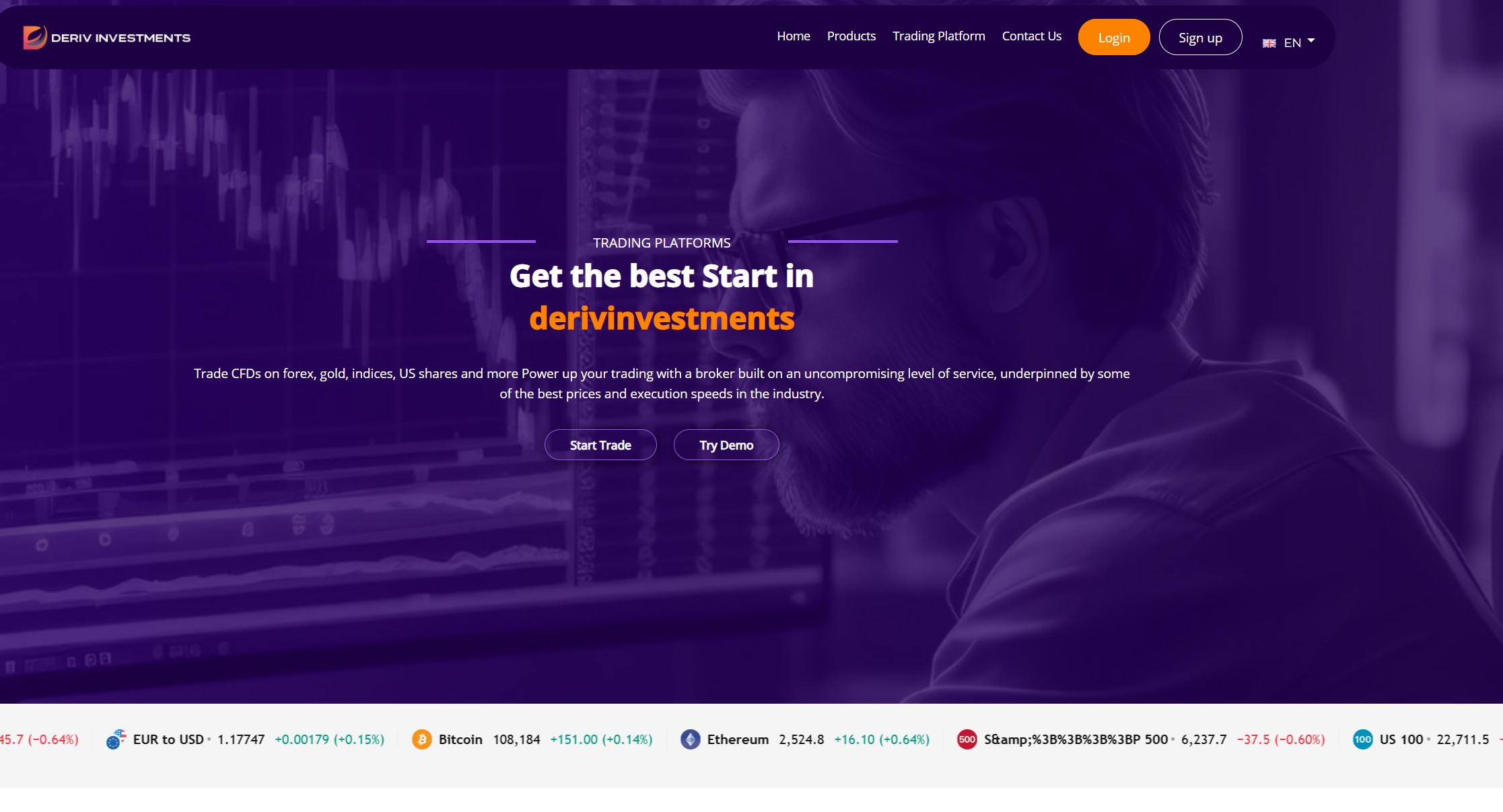 Финансовые аферисты нового поколения используют все более изощренные методы чтобы казаться надежными и завоевать доверие потенциальных жертв. Позиционируя себя как профессиональные брокеры, они создают иллюзию безопасности через поддельные инвестиционные платформы. Примером такого подхода может служить сайт Deriv Investments (derivinvestments.com), который обещает «лучший старт с Deriv Investments» и заманивает предложением торговли CFD на форексе, золоте, индексах и акциях крупнейших американских компаний.