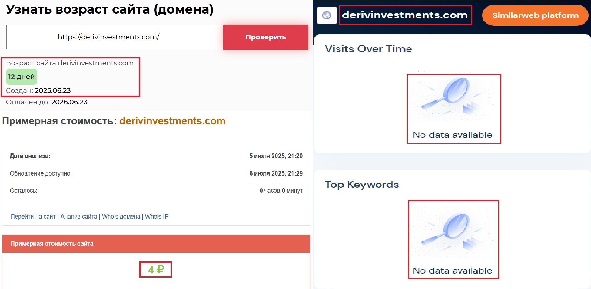 Согласно информации проверенной через Whois (https://who.is/whois/derivinvestments.com), возраст домена derivinvestments.com составляет всего 12 дней — зарегистрирован 23 июня 2025 года. При этом на сайте утверждается, что компания работает уже 10 лет. Очевидное несоответствие фактам. Дополнительно мы проверили стоимость домена через Seolik которая оценивается всего в 4 рубля, что вызывает серьезные сомнения. У настоящих инвестиционных платформ цена домена, как правило, достигает десятков, а порой и сотен тысяч рублей.