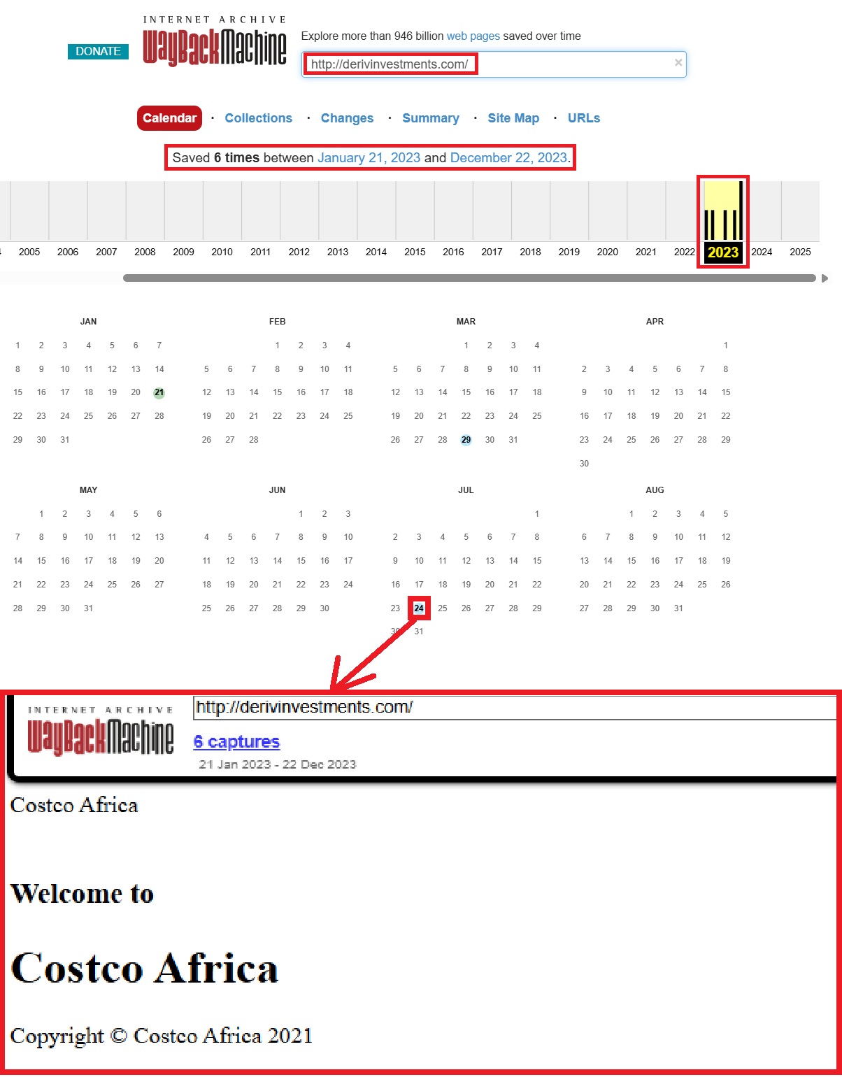 Мы провели анализ посещаемости сайта derivinvestments.com через Similarweb и получили результат: данные отсутствуют. Это свидетельствует о том, что ресурс практически не привлекает аудиторию. Чтобы убедиться в том, что герой данного обзора работает нелегально, мы проверили его историю через Веб-Архив (https://web.archive.org/web/20230724002554/https://derivinvestments.com/), где хранятся копии всех сайтов за время их существования, так вот — 24 июля 2023 года домен принадлежал некоему Costo Africa.