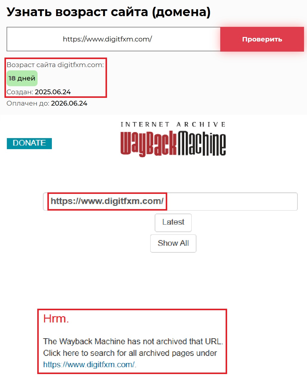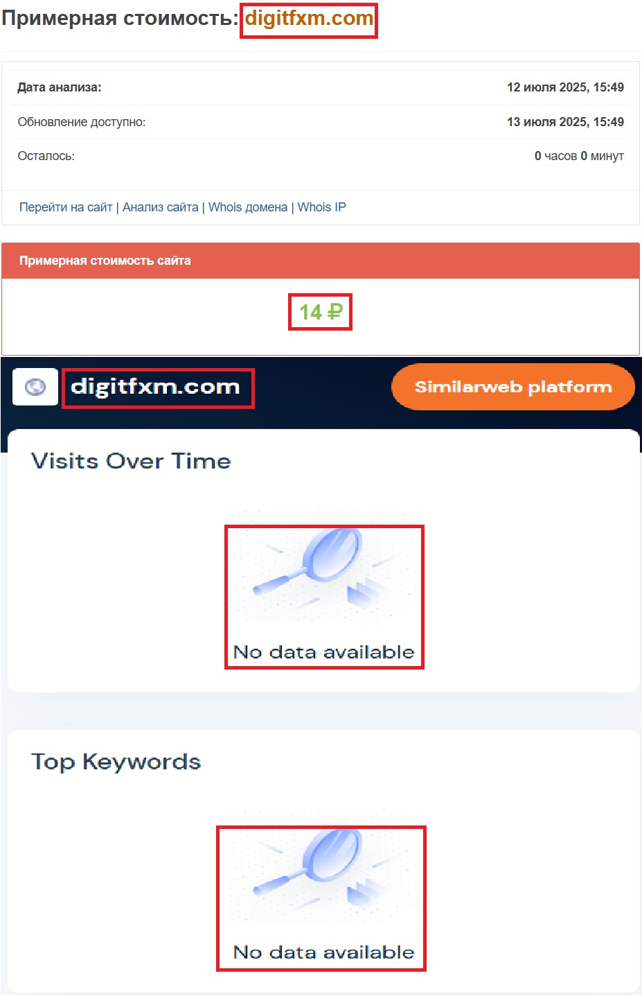 Если открыть этот сайт через Веб-Архив (https://web.archive.org/web/20250711062436/https://www.digitfxm.com/), станет ясно: никакой истории существования у платформы нет. Вся «деятельность» началась совсем недавно, ведь этот сервис сохраняет копии сайтов за все время их работы, а здесь их нет. Настоящие брокеры годами развивают свои ресурсы, накапливают репутацию. А здесь — пустота.