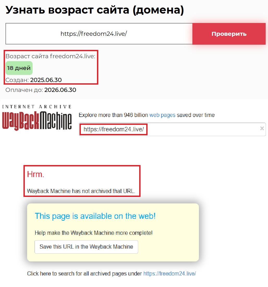 Переходим в Веб-архив (https://web.archive.org/web/20250000000000*/https://freedom24.live/), где хранится история сайтов. Ни одного следа, ни одной копии. То есть о “годы доверия и стабильности” речи идти не может — перед нами очередной брокер-однодневка, лепящий легенду на ходу.