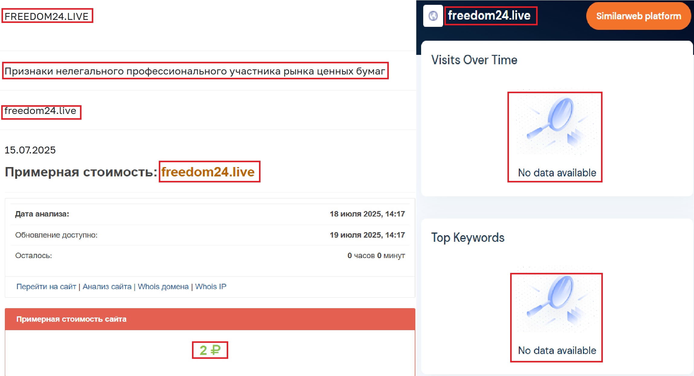 Seolik — сервис оценки сайтов — показывает, что ресурс стоит буквально 2 рубля. Для сравнения: у легальных брокеров стоимость сайта может достигать сотен тысяч. SimilarWeb, который показывает трафик, также не фиксирует никакой реальной посещаемости. Это значит, что пользователи туда просто не заходят — проект никому не интересен.