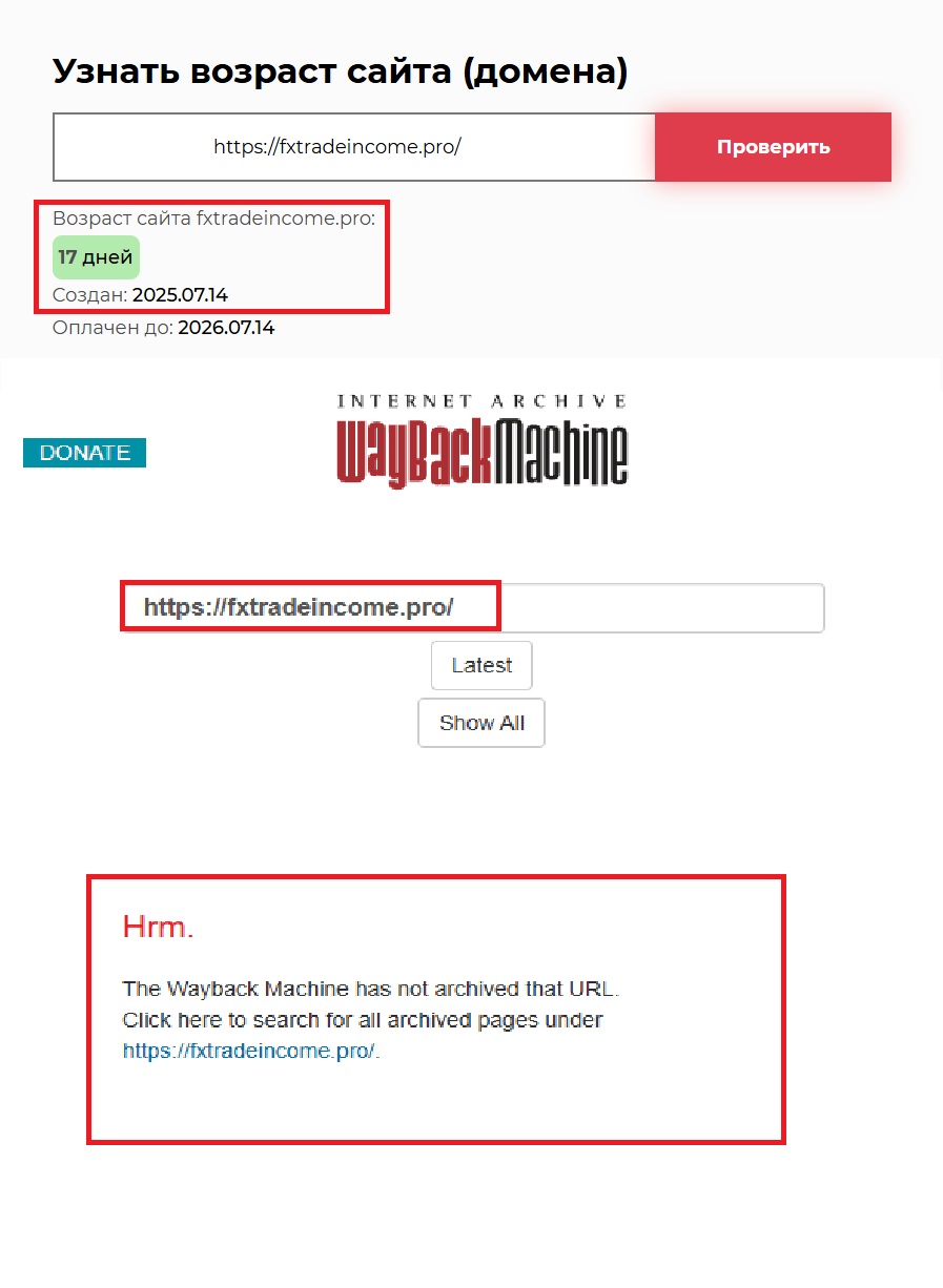 Затем проверили через Web Archive (https://web.archive.org/web/2/https://fxtradeincome.pro/), платформу, где сохраняется история сайтов: домен FX Trading Income не имеет ни одной записи. Никто до этого времени его даже не видел, а значит, никакой репутации — лишь сиюминутная онлайн-платформа.