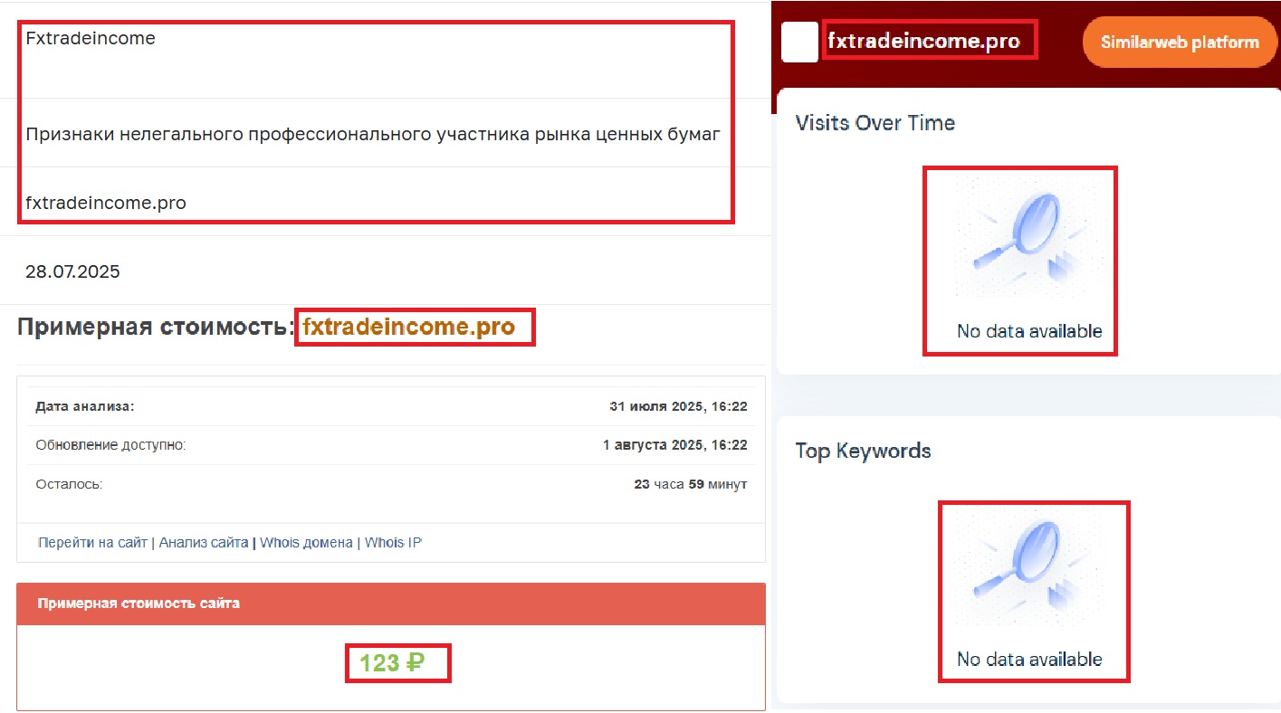 Далее Seolik — система для оценки сайтов. Она оценивает fxtradeincome.pro всего в 123 рубля. Не опечатка: чуть больше сотни! При том, что настоящие инвестиционные компании вкладывают сотни тысяч, а здесь шаблонный сайт. Анализ SimilarWeb подтверждает: ни трафика, ни аудитории. Проще говоря — никому не интересен.