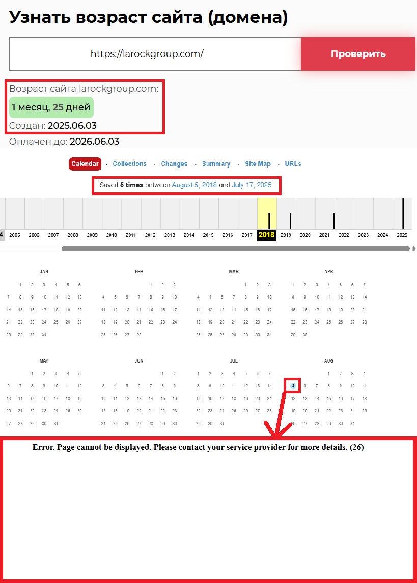 Сайт выглядит вылизанным, но по факту это мыльный пузырь. Если заглянуть в Веб-Архив (https://web.archive.org/web/20180805092914/https://larockgroup.com/) — это сервис, хранящий снимки сайтов в разные периоды времени — обнаружим, что 5 августа есть первая копия страницы, но она, как оказалось, была нерабочей, ее просто перекупили. В Whois, инструменте для проверки регистрации доменов, указана дата создания — 3 июня 2025 года. То есть “компании с историей” просто не было и нет.