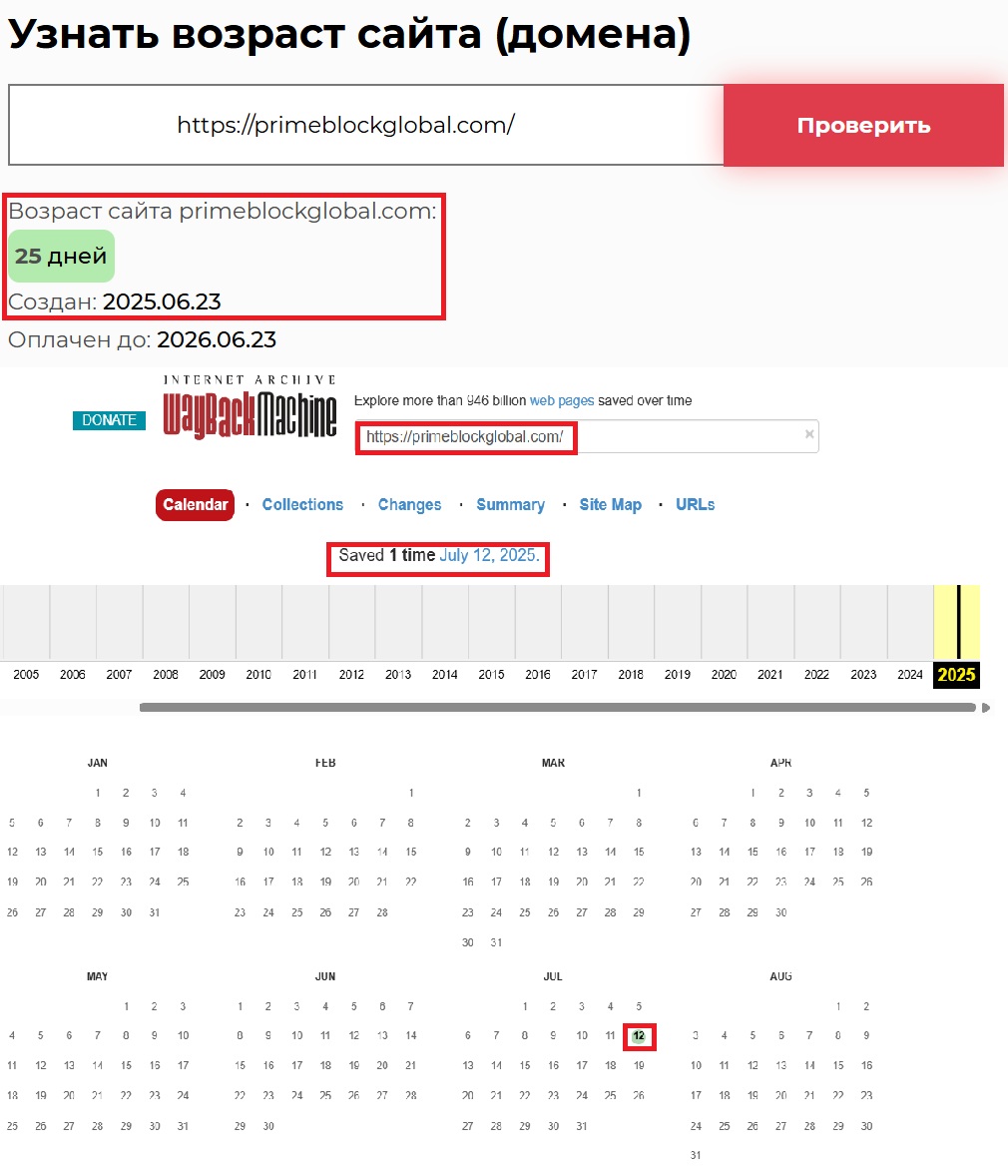 Согласно данным Веб-Архива (https://web.archive.org/web/*/https://primeblockglobal.com/), сайт был впервые зафиксирован лишь 12 июля 2025 года. То есть его возраст — всего 25 дней. Whois (https://who.is/whois/primeblockglobal.com) демонстрирует реальную дату — домен зарегистрирован 23 июня 2025 года. Доверие к “глобальному брокеру” с таким стажем? Сомнительно.