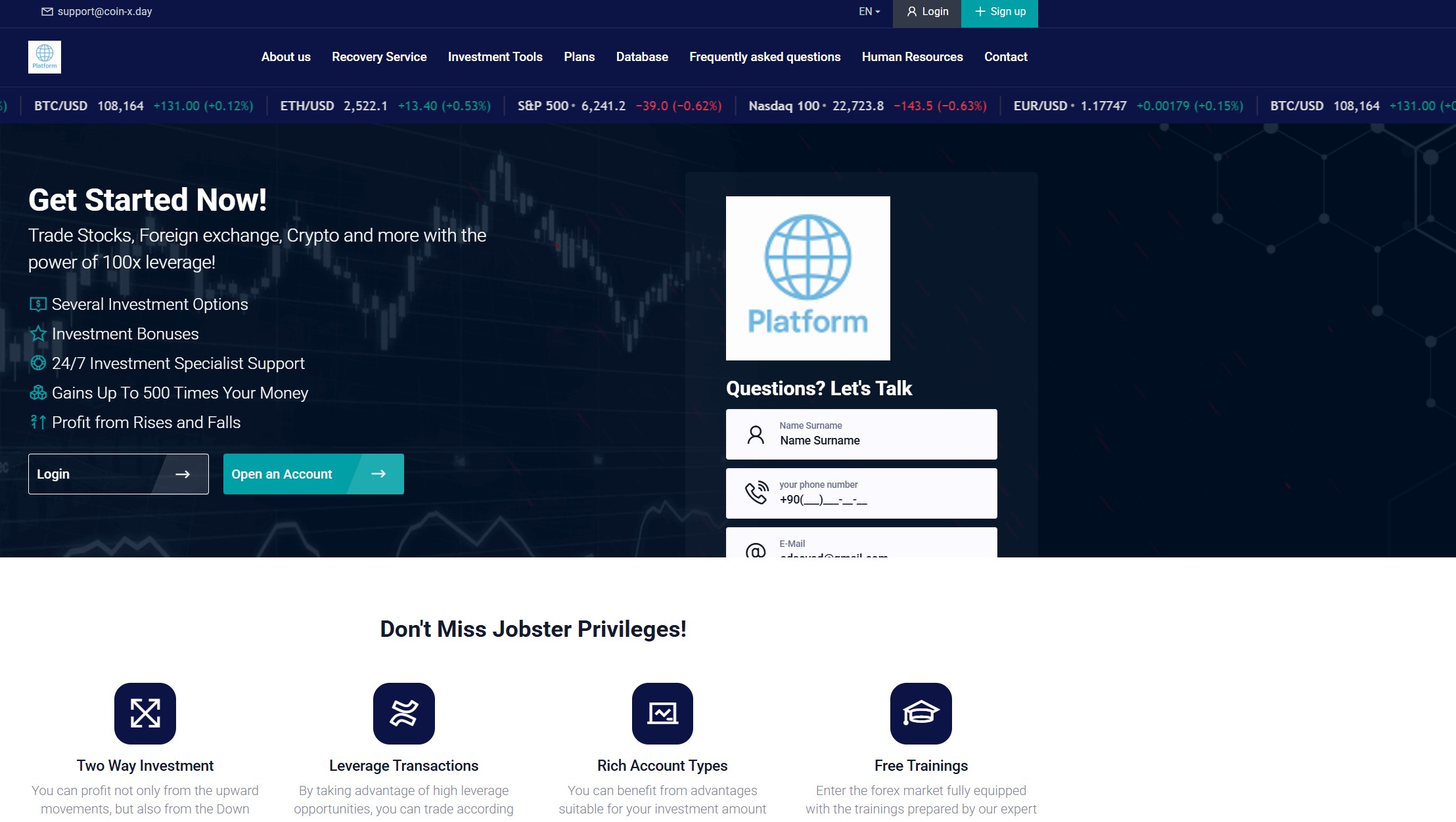 В интернете все больше “волшебных” платформ, где вам обещают быстрый заработок на международной торговле. Один из таких проектов — Profit-X (profit-x.click). Уже на главной странице встречают фразой: «Торгуйте акциями, иностранной валютой, криптовалютой и многим другим с помощью кредитного плеча 100x», а из обещаний: несколько вариантов инвестирования, инвестиционные бонусы, круглосуточная поддержка специалистов по инвестициям, прибыль до 500 раз больше ваших вложений, получаемая от взлетов и падений. Звучит красиво, согласитесь. Но стоит хоть немного проанализировать информацию глубже — и картина меняется. Перед нами — очередной лжеброкер, маскирующийся под серьезную организацию.