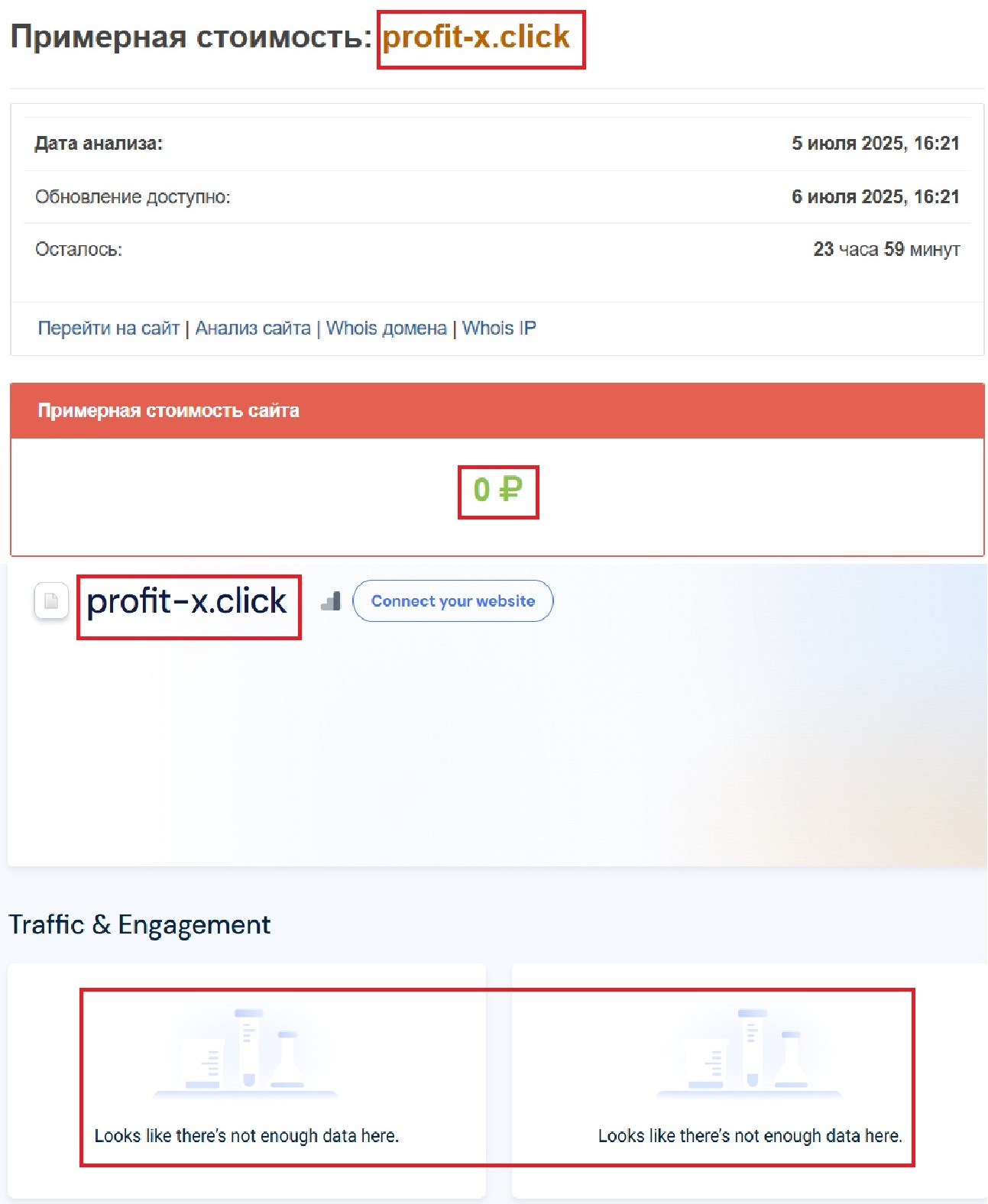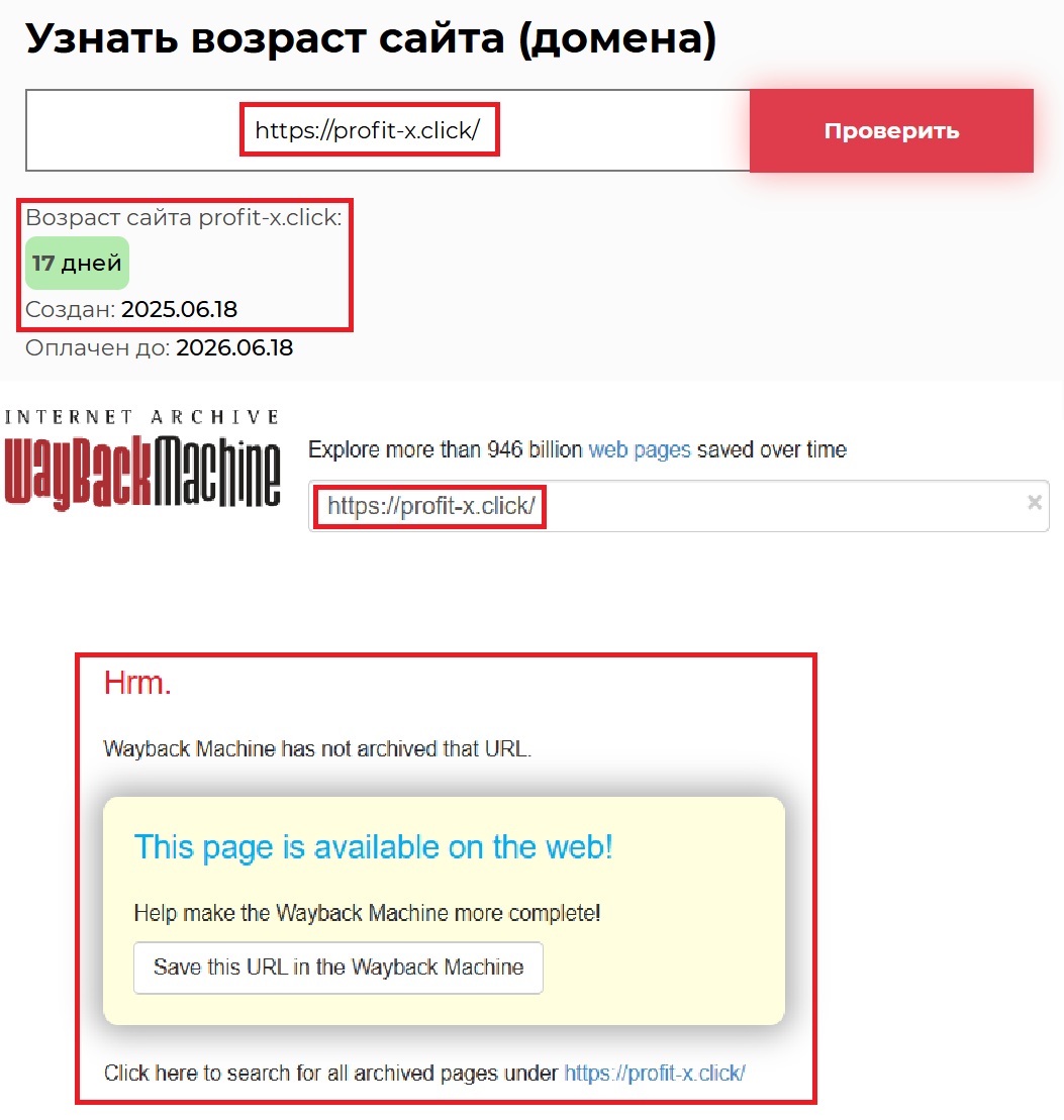 Заглянем в Веб-Архив (https://web.archive.org/web/2/https://profit-x.click/) — сервис, где фиксируется история сайтов. Результат? Пусто. Ни одной сохраненной копии. То есть проект не просто молодой — он возник буквально “на днях”. Все, что они рассказывают про “долгую и успешную работу”, — откровенный вымысел.