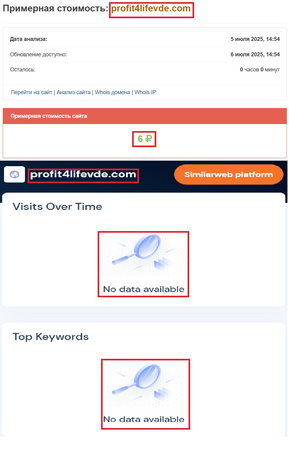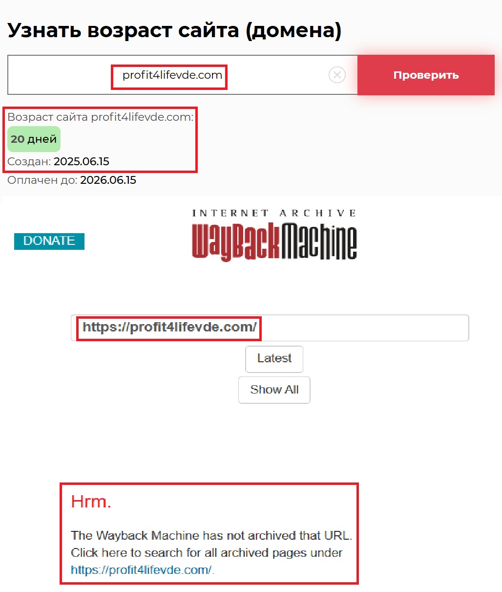 А если заглянуть в Веб-Архив (https://web.archive.org/web/20240501000000*/https://profit4lifevde.com/), то становится совсем смешно — сайт туда даже не попал. А это значит, что он настолько новенький, что и зафиксировать его еще не успели. Все, что нам показывают — просто обертка, без истории, без фундамента.