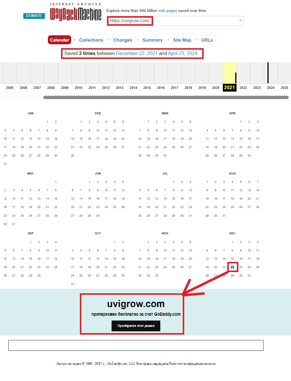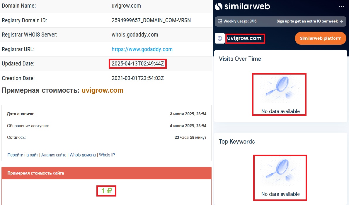 Проверим еще одну вещь — историю сайта через Веб-Архив (https://web.archive.org/web/20250000000000*/https://uvigrow.com/). И что же мы видим? Первое сохранение — 22 декабря 2021 года. До этого сайт не существовал. А ведь это не мелочь — если кто-то утверждает, что работает почти 8 лет, а при этом не оставил в сети ни следа, — вывод очевиден: врут. К тому же, если вы обратите вниманиен а скриншот выше, то заметите, что на тот момент домен Uvigrow (uvigrow.com) был выставлен на продажу. Это в очередной раз подтверждает что мошенники приобрели старый домен.
