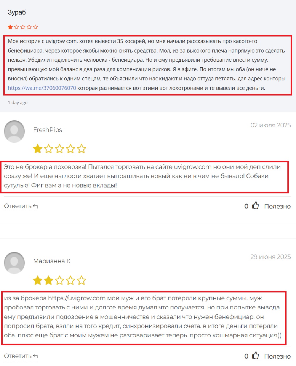 “Я всю жизнь пахал, откладывал деньги, думал что потом смогу жить безбедно, но по итогу просто отдал свои кровные жуликам! Я все еще не могу отойти от шока. Uvigrow — самый яркий пример нелегальных проектов и я надеюсь что их закроют как можно скорее! Не будьте такими наивными как я, легких денег не бывает”