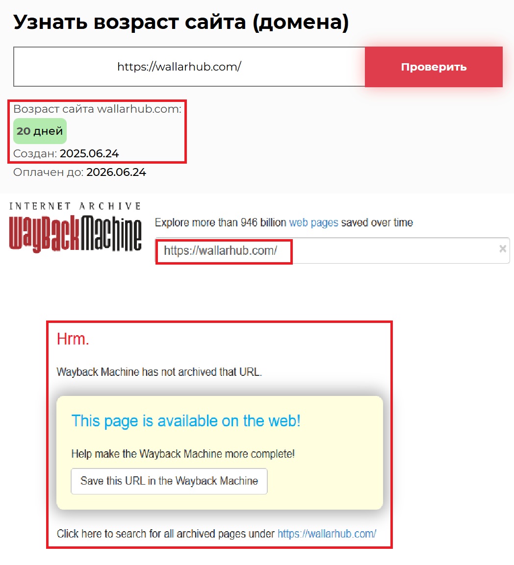 Первое, что сразу вызывает сомнение — это несостыковка в сроках. На сайте указано, что компания якобы существует уж 8 лет! Но стоит зайти в сервис Whois (https://who.is/whois/wallarhub.com), чтобы проверить дату регистрации домена — и все встает на свои места. Домен создан только 24 июня 2025 года. Это типичная уловка — заявить о «многолетнем опыте», просто создав новый домен.