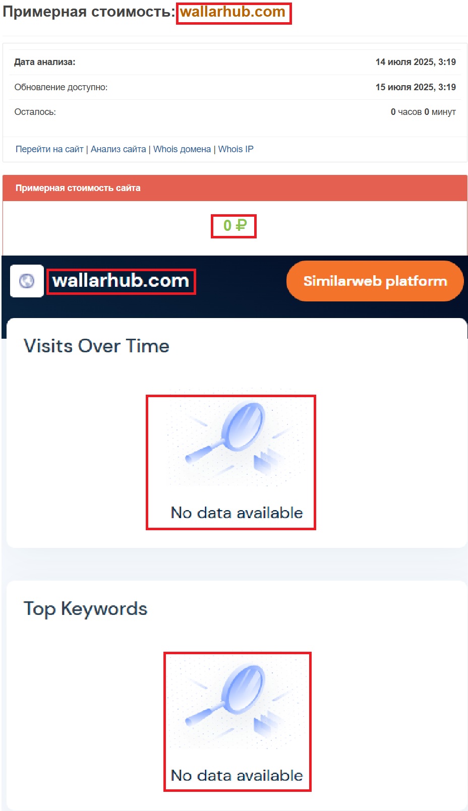 Историю сайта легко отследить через Веб-Архив (https://web.archive.org/web/2/https://wallarhub.com/), где отображаются сохраненные копии страниц в разные периоды времени. Видим, что до недавнего времени никакой активности там и близко не было. Дальше — еще интереснее. Если проверить стоимость ресурса через сервис Seolik, то цифра удивляет: 0 рублей. Для «международной платформы» это откровенное дно.