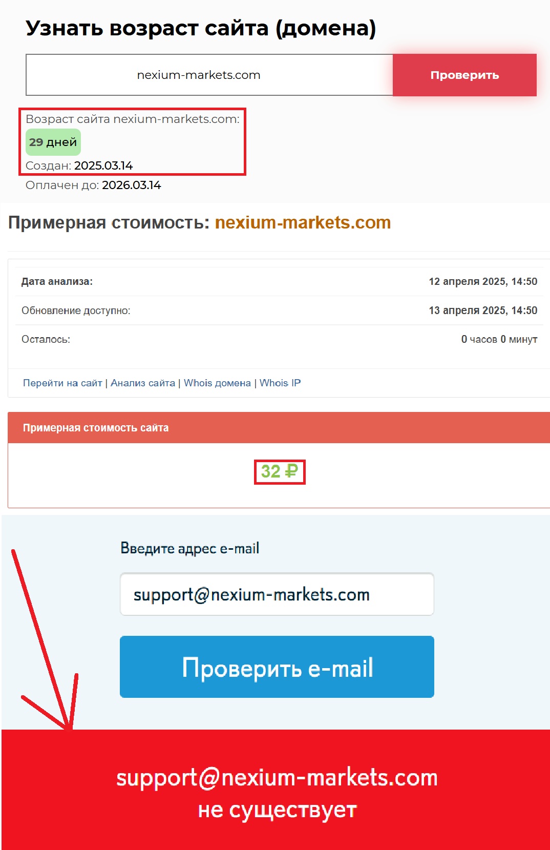 Интересно, что стоимость всего этого великолепия, по данным независимых сервисов, составляет всего 32 рубля. Не в переносном, а в самом буквальном смысле. Вы представляете себе уважаемую финансовую платформу, чей домен стоит дешевле чашки кофе? Мы — нет. И это еще не все. Дата запуска сайта — 14 марта 2025 года. То есть, на момент нашей проверки проекту исполнилось… всего 29 дней. Даже месяц не работают! Какой уж тут “опыт на международных рынках”?