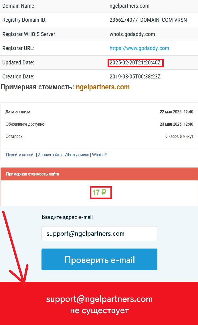 Цены тоже поражают. Вернее, наоборот — не поражают. Стоимость домена, если верить открытым данным, составляет всего 17 рублей. Это меньше стоимости проезда в транспорте. Это уже не просто тревожный звонок — это сирена. Серьезный брокер не экономит на элементарных вещах, правда же? Что еще? Ах да, контакты. Указан какой-то адрес в Сент-Винсент и Гренадинах, есть почтовый ящик support@ngelpartners.com. Казалось бы, все как у людей. Но к сожалению оба пункта оказались фальшивыми.