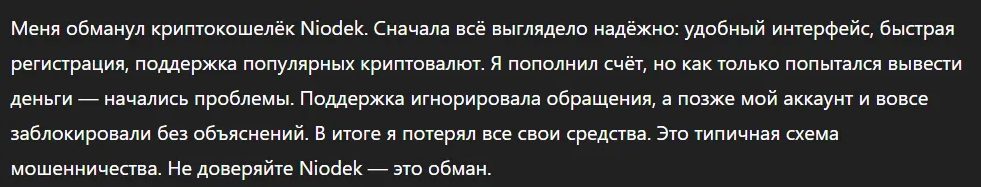 Также хочется упомянуть о появлении в сети негативных отзывов об Niodek. Люди жалуются на проблемы с выводом средств, потерю своих вложений.