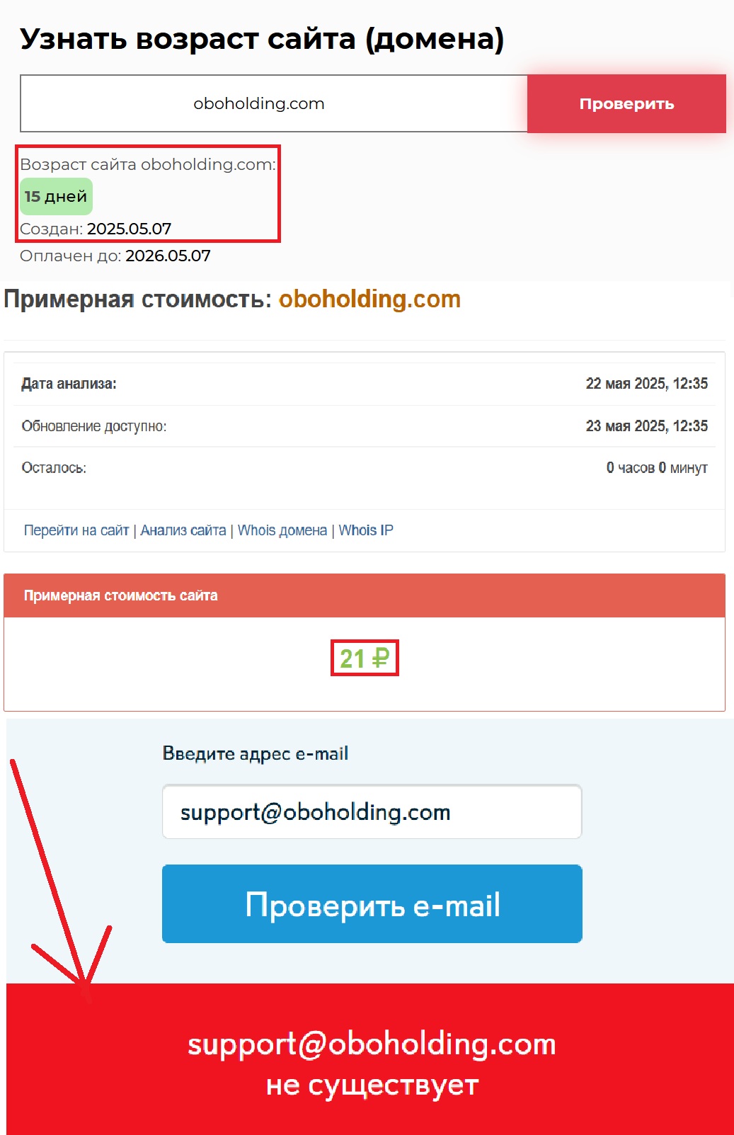 Цена домена? Да вы только вдумайтесь — 21 рубль. Серьезно. Это даже не смешно. Это прямая демонстрация того, насколько дешево оценили свою “компанию” ее же владельцы. Добавим сюда неработающую форму обратной связи, фальшивый адрес электронной почты support@oboholding.com, отсутствие в реестрах и никаких следов офиса, который якобы расположен в Малайзии. Все это — ложь, красиво поданная, но все же ложь.