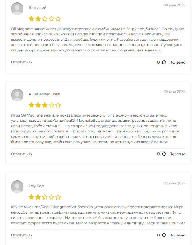Oil Magnate продвигается через канал и бот в мессенджере, что делает ресурс доступным для широкой аудитории, и в это же время увеличивает риски для тех, кто решает принять участие в проекте. Бывшие игроки жалуются на отсутствие прозрачности в плане информации о разработчиках, юридическом статусе и механизмах работы. Только эти перечисленные нюансы уже вызывают немало вопросов и указывают на возможный типичный финансовый обман.